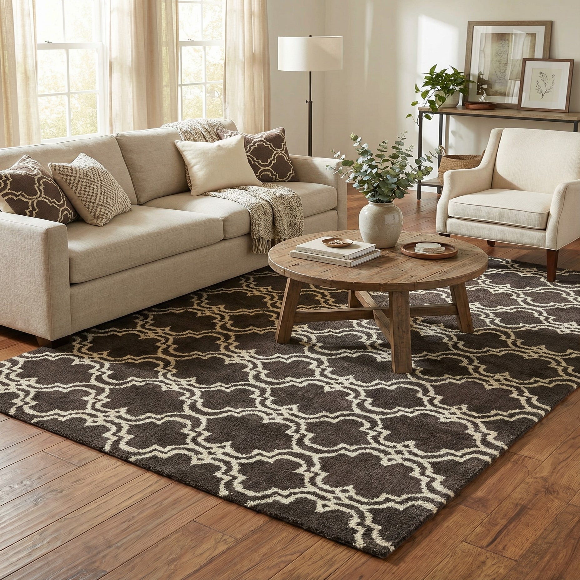 Primary color is Brown. Colors in this rug include: Brown, Ivory.
