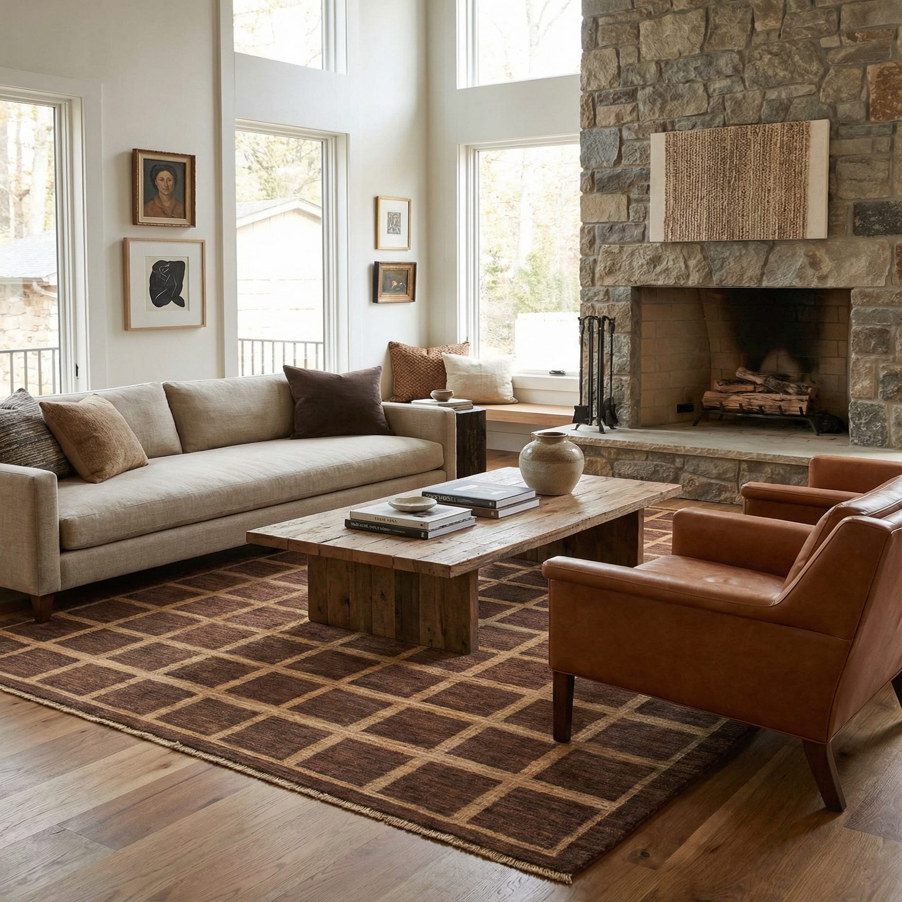 Primary color is Brown. Colors in this rug include: Brown, Cream, Light Brown.