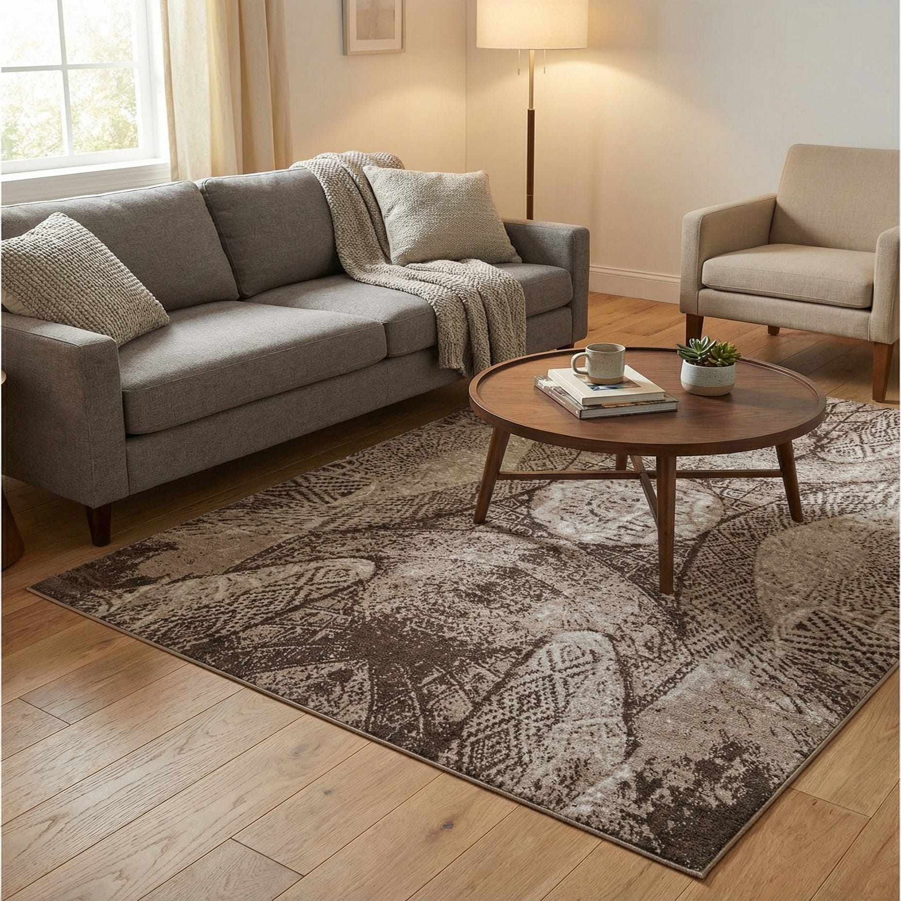 Primary color is Brown. Colors in this rug include: Brown, Beige, Ivory.