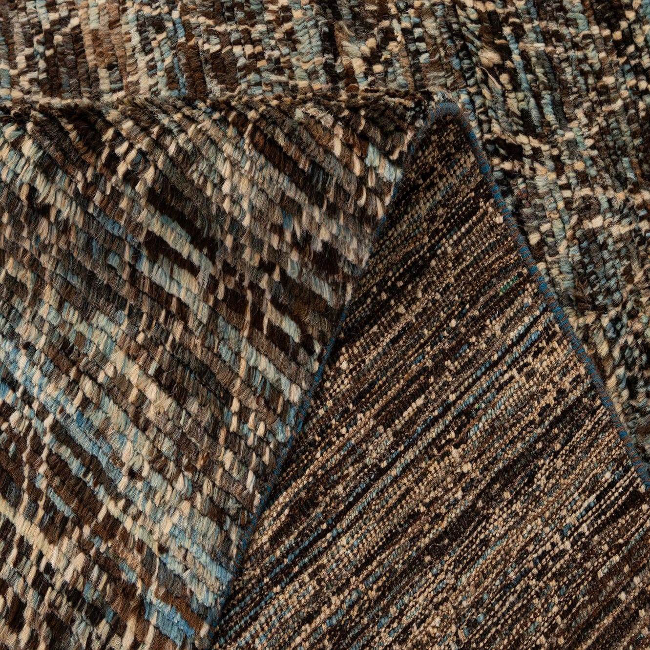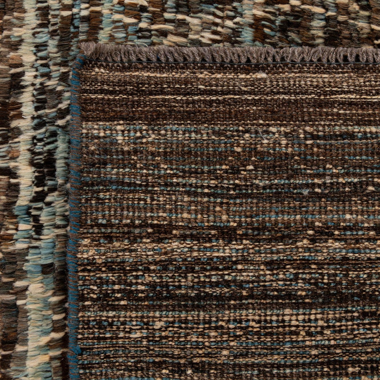 Primary color is Brown. Colors in this rug include: Brown, Beige, Ivory, Blue.