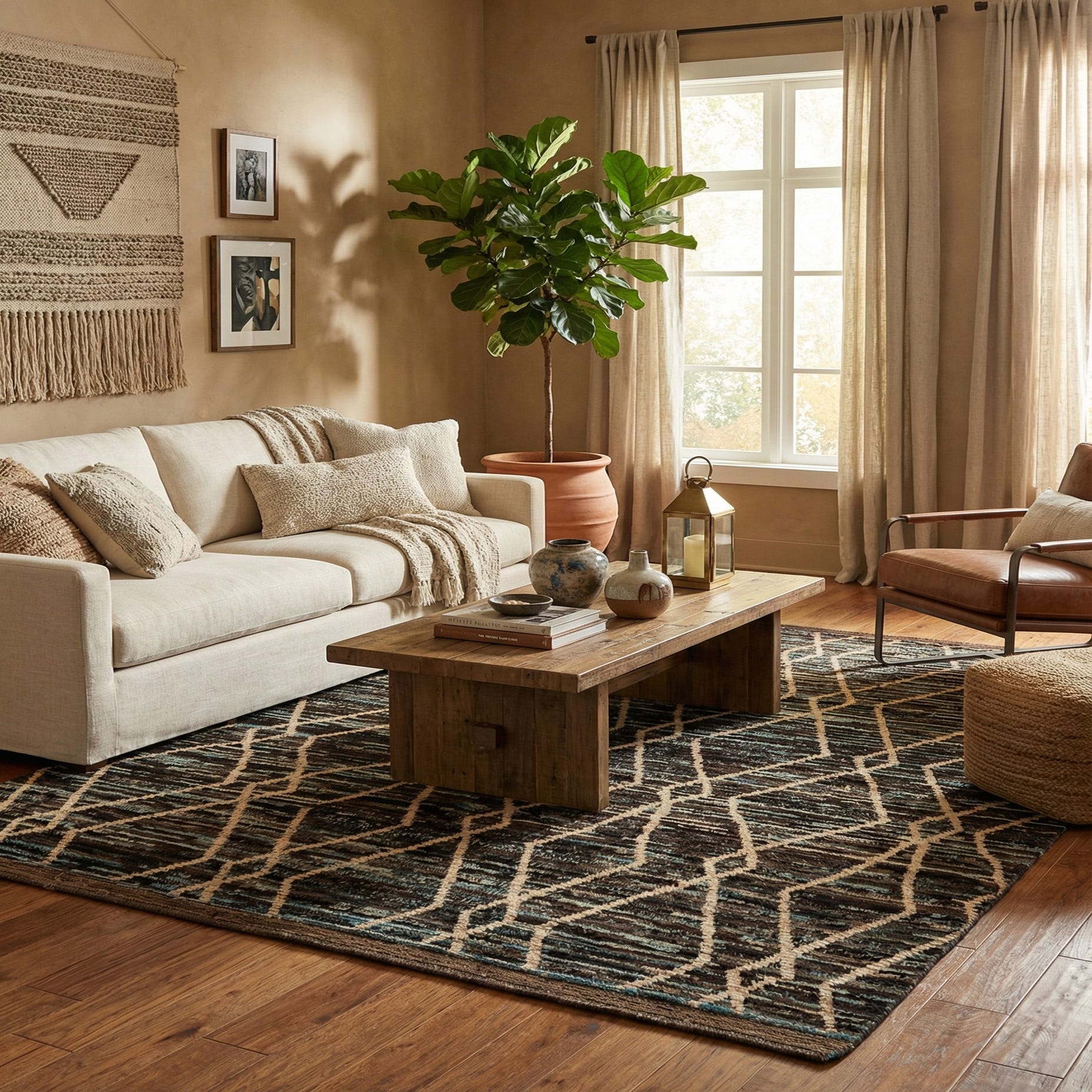Primary color is Brown. Colors in this rug include: Brown, Blue, Cream, Gray.