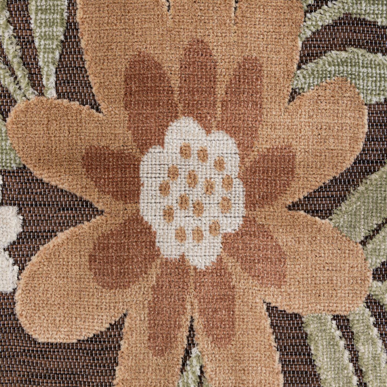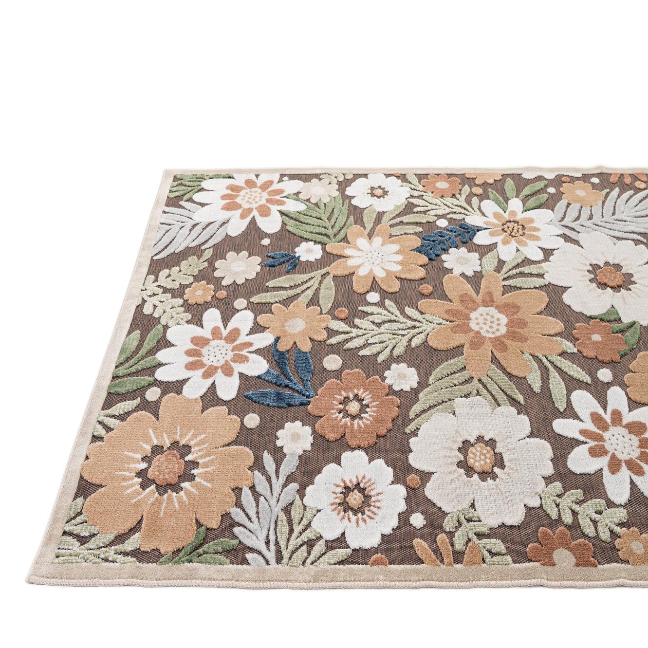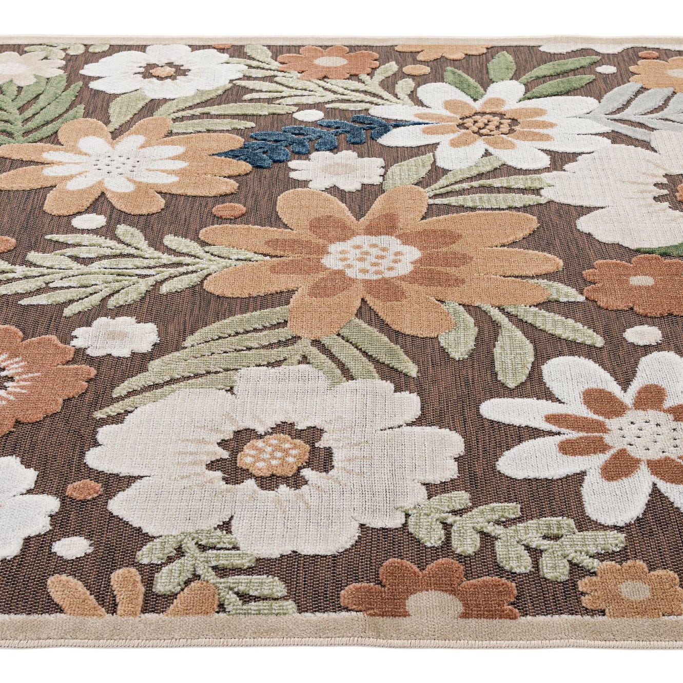 Primary color is Brown. Colors in this rug include: Brown, Ivory, Navy Blue, Green, Peach.