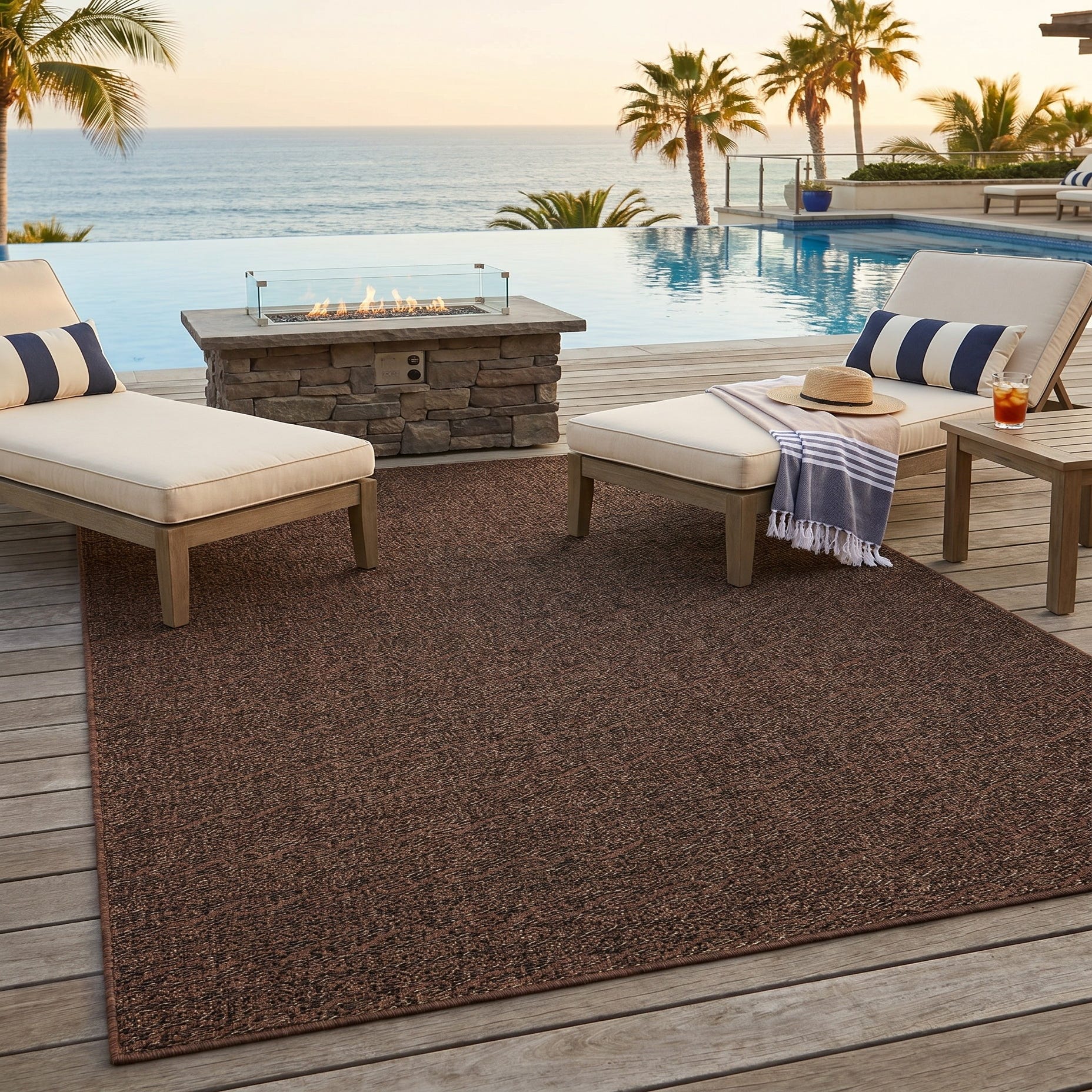 This rug looks rich and feels very durable. I shopped for a couple of weeks online everyday in search of a reasonably priced rug that was good looking and had great reviews. All of the outdoor rugs that I could afford and that looked great had terrible reviews about how horribly made they were. I came upon this one it had wonderful reviews and it was on sale for less than 100.00! It came nicely rolled instead of folded like other sites which meant it had no permanent creases I unrolled it and it was sturdy expensive looking and it laid perfectly flat! You won't be sorry if you purchase this!