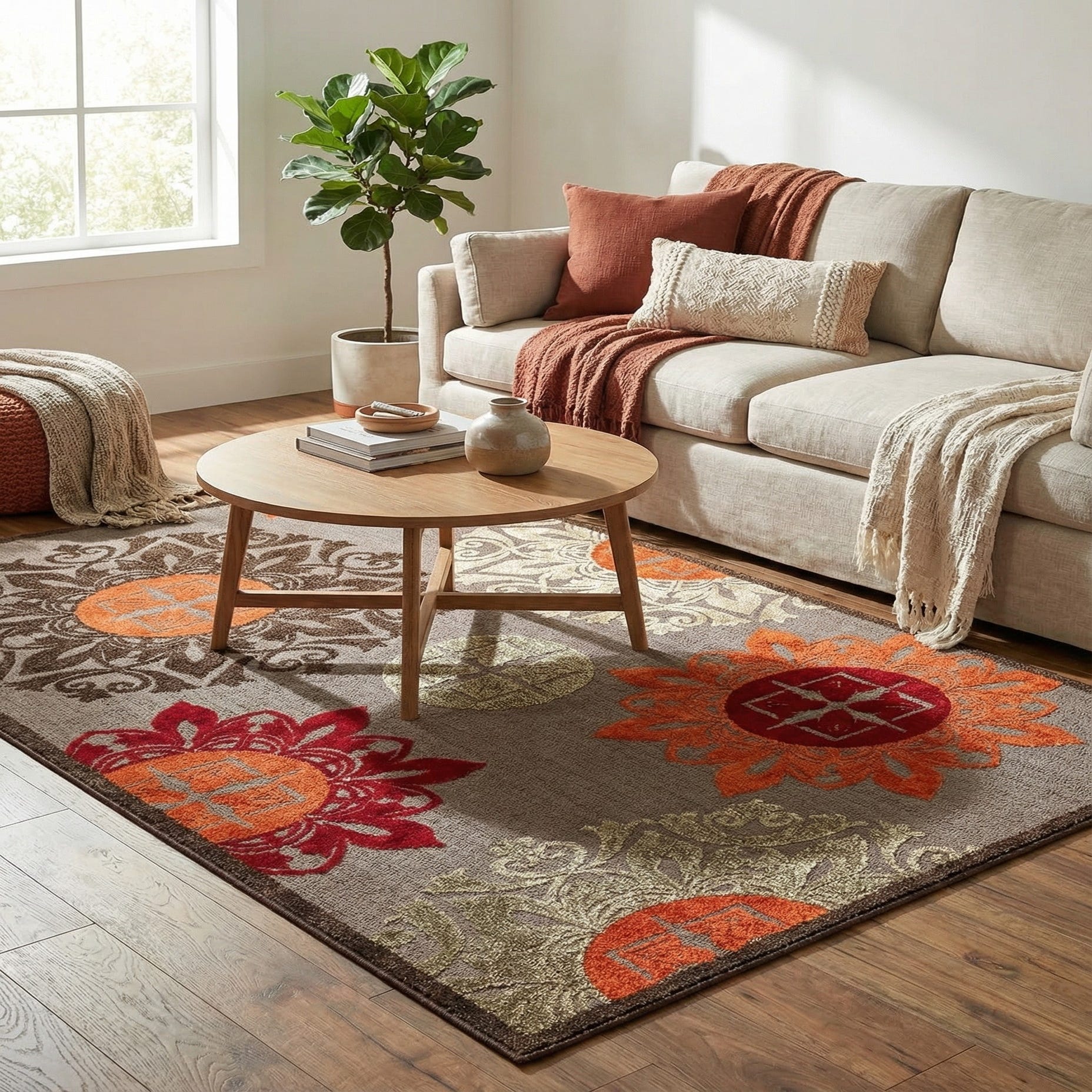 Primary color is Brown. Colors in this rug include: Brown, Beige, Gray, Orange, Red.