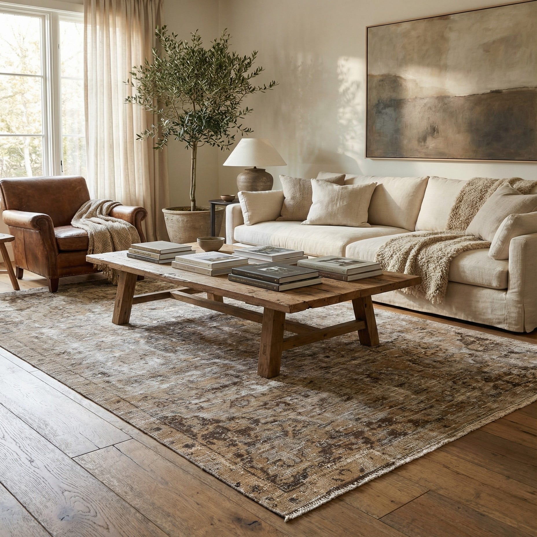 Primary color is Brown. Colors in this rug include: Brown, Light Brown, Ivory, Navy Blue.