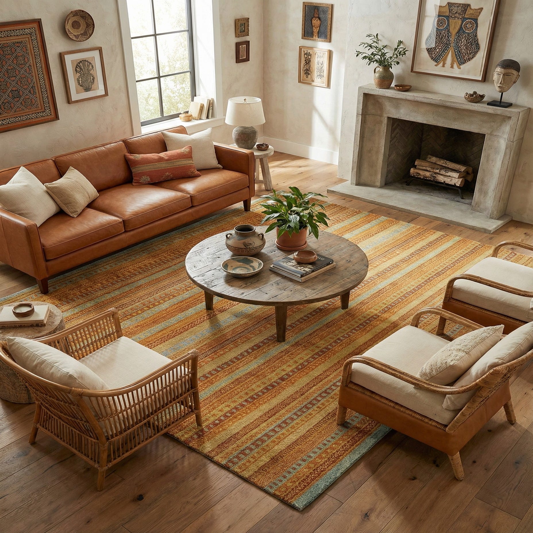 Primary color is Brown. Colors in this rug include: Brown, Brown, Orange, Red, Olive, Yellow.