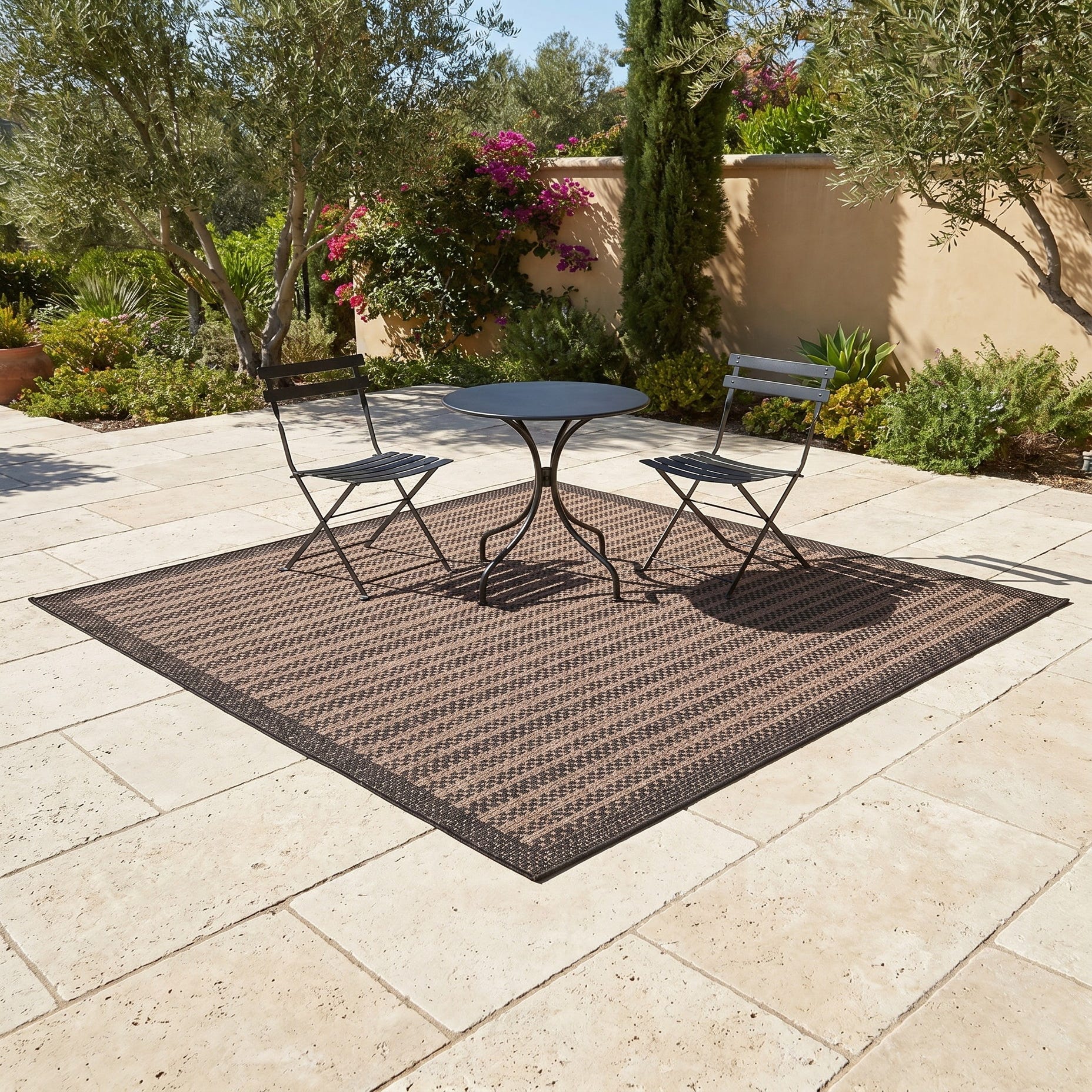 I really like the fact you can sweep it off very easily where some rugs including one I had purchased before this one collected grass and debris in the grooves. I also ordered a 6 x 9 beige rug with/flower print that I got for $53 but decided to go with the brown rug (5 Ă— 8) this year. Rugs have a durable straw feel. Pretty much what I expected. Just one downer...with a heavy wind the sides can roll up. I purchased a double sided tape which I haven't used yet but that should NOT stop anyone from purchasing the outdoor botanical rugs.