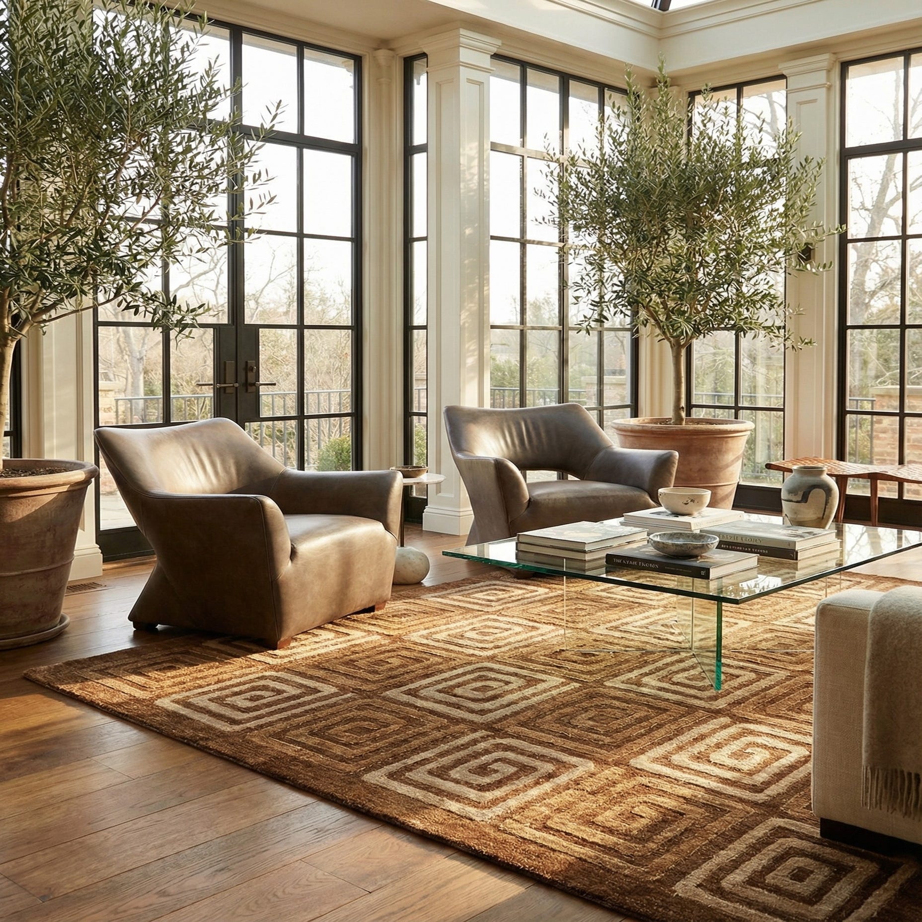 Primary color is Brown. Colors in this rug include: Brown, Brown, Beige.