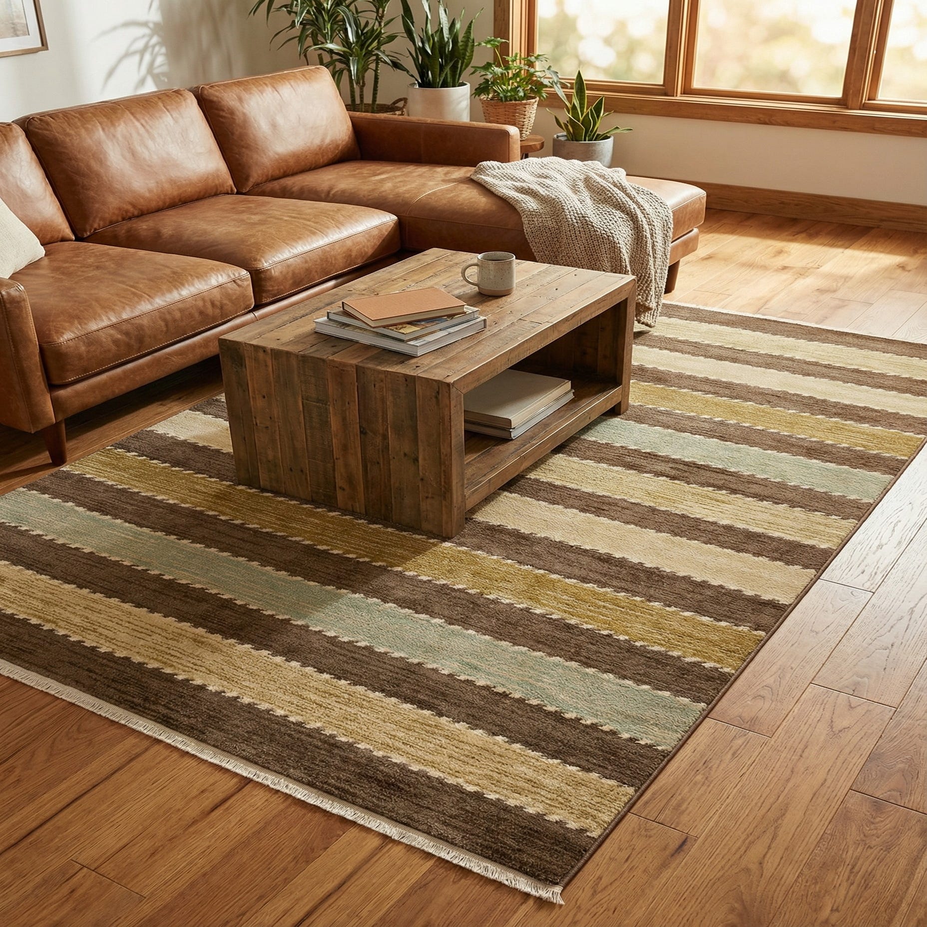 Primary color is Brown. Colors in this rug include: Brown, Cream, Light Blue, Light Brown, Olive, Tan.