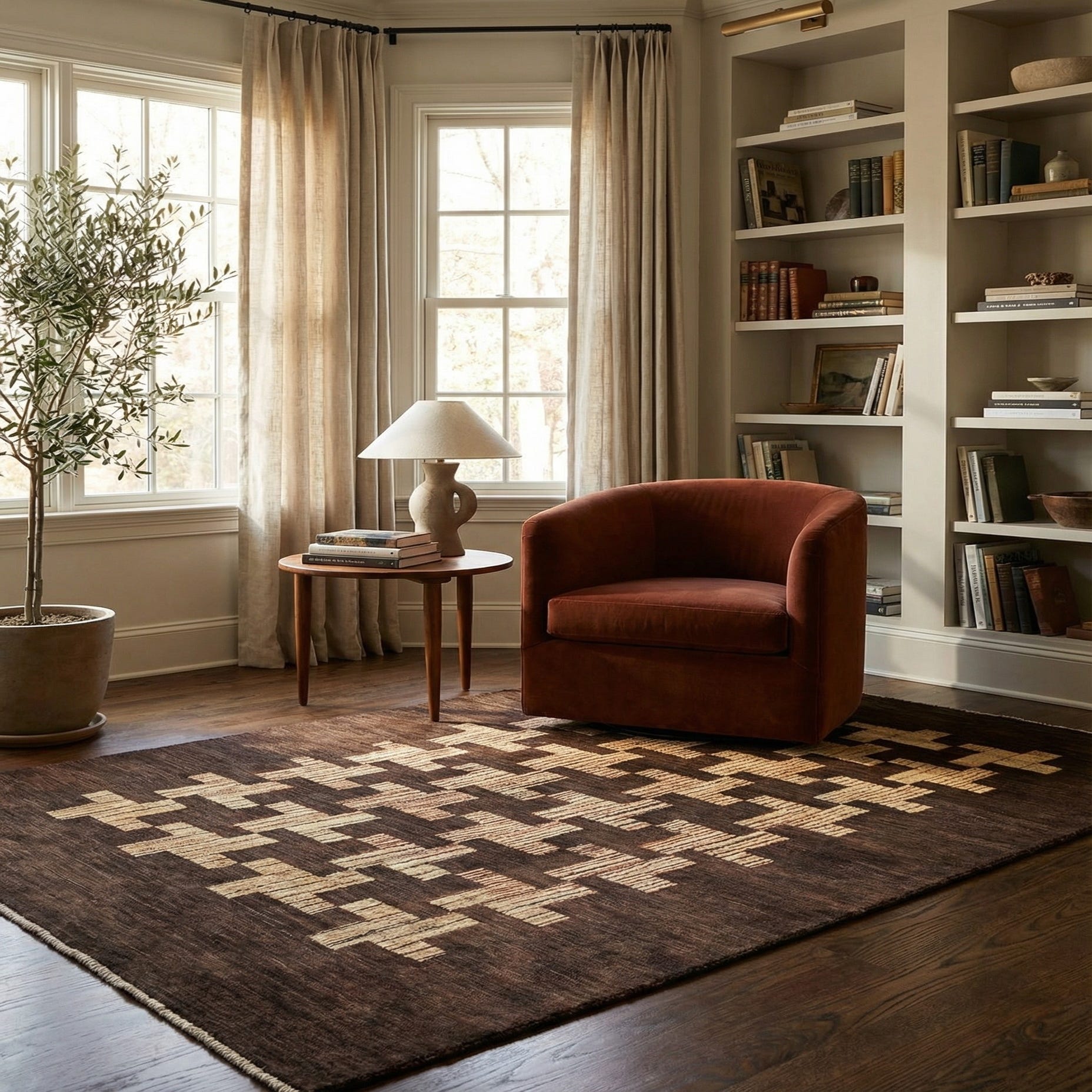 Primary color is Brown. Colors in this rug include: Brown, Beige, Cream, Red, Gold, Olive.