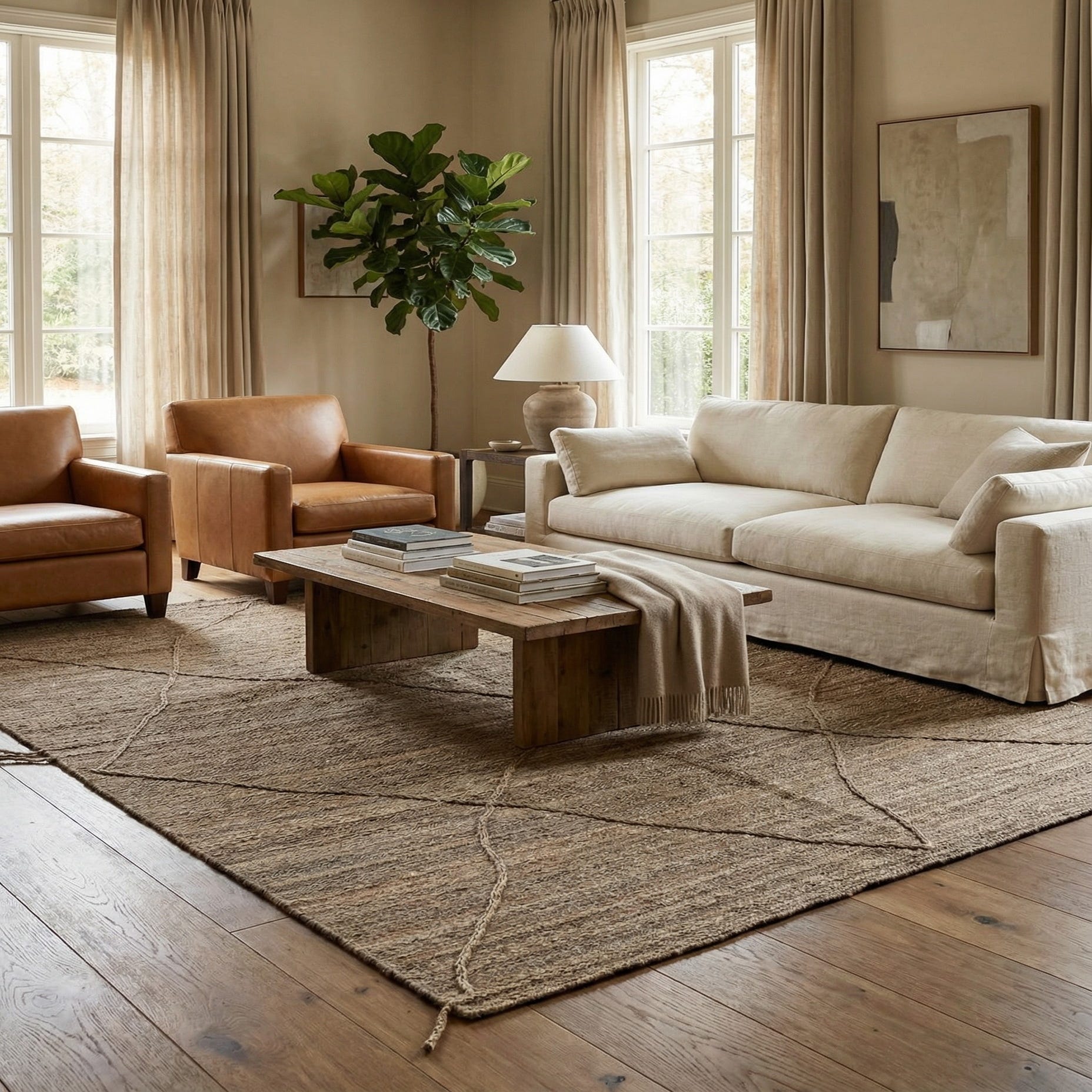 Primary color is Brown. Colors in this rug include: Brown, Beige.