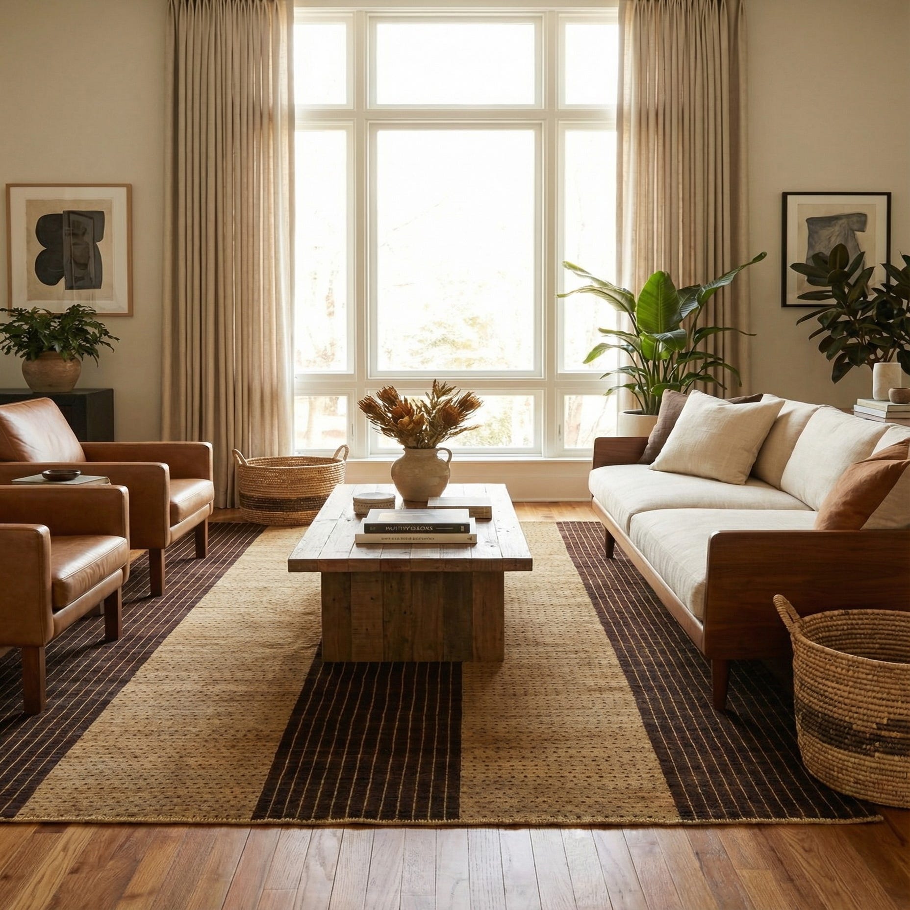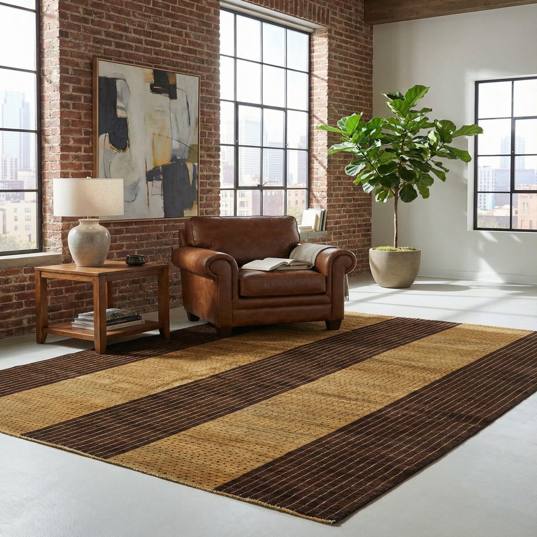 Primary color is Brown. Colors in this rug include: Brown, Beige, Cream.