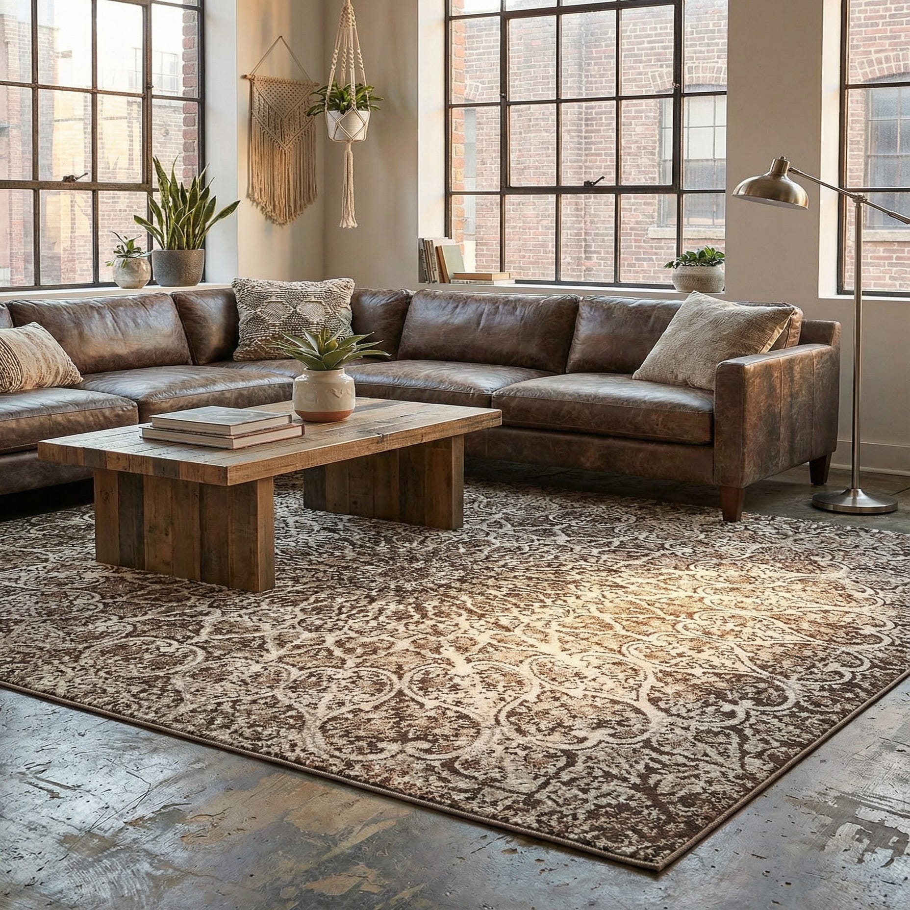 Primary color is Brown. Colors in this rug include: Brown, Ivory, Light Brown.
