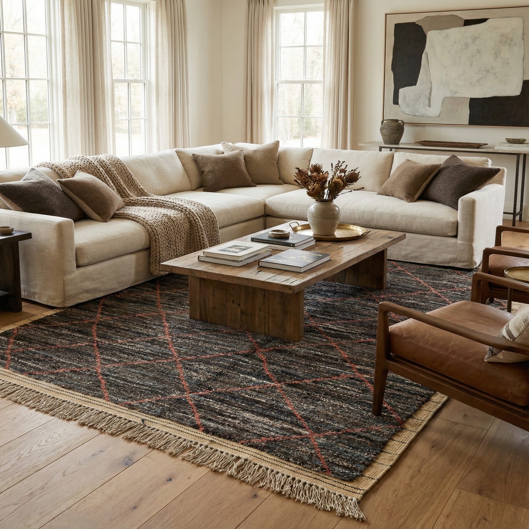 Primary color is Brown. Colors in this rug include: Brown, Light Brown, Red, Gray.