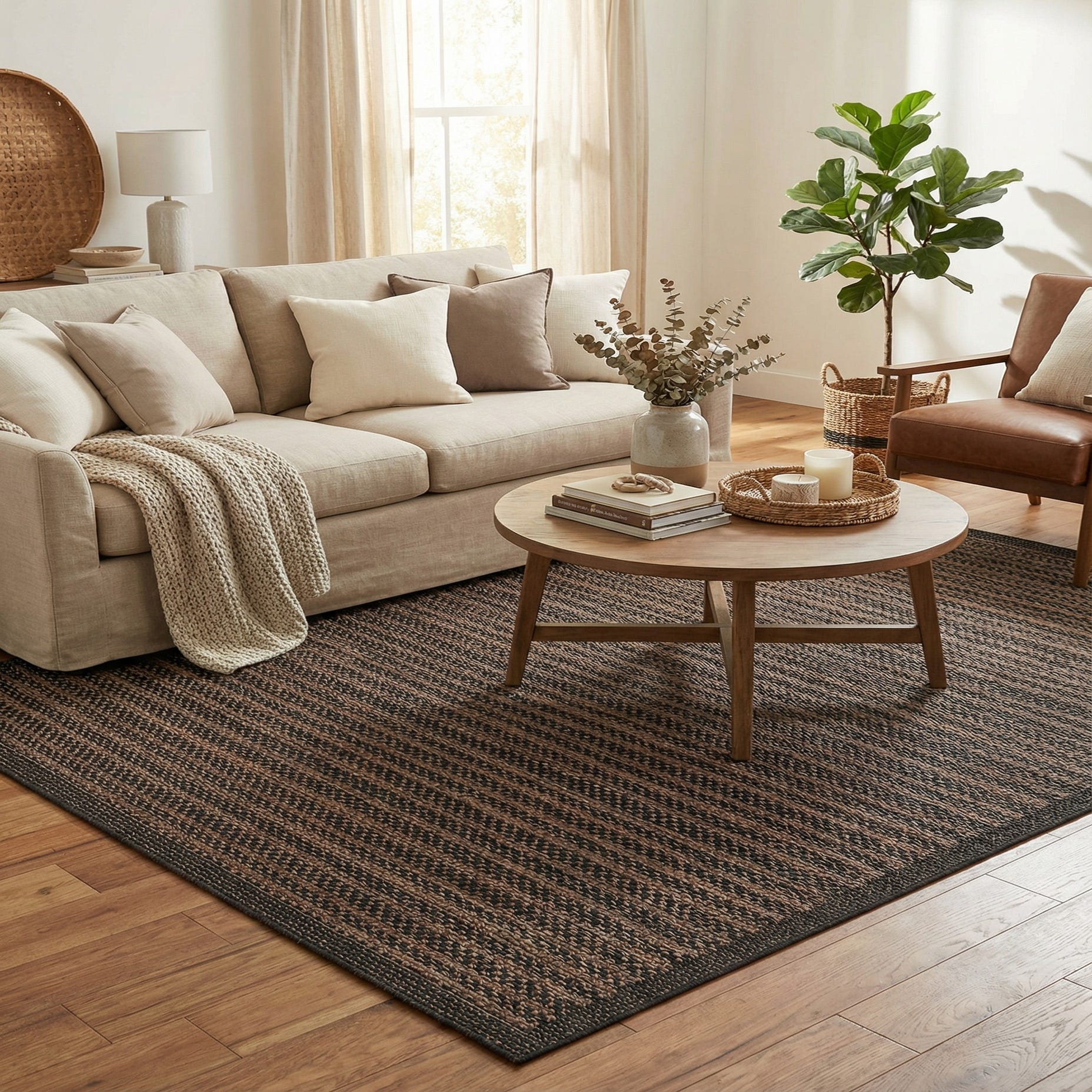 Primary color is Brown. Colors in this rug include: Brown, Black.