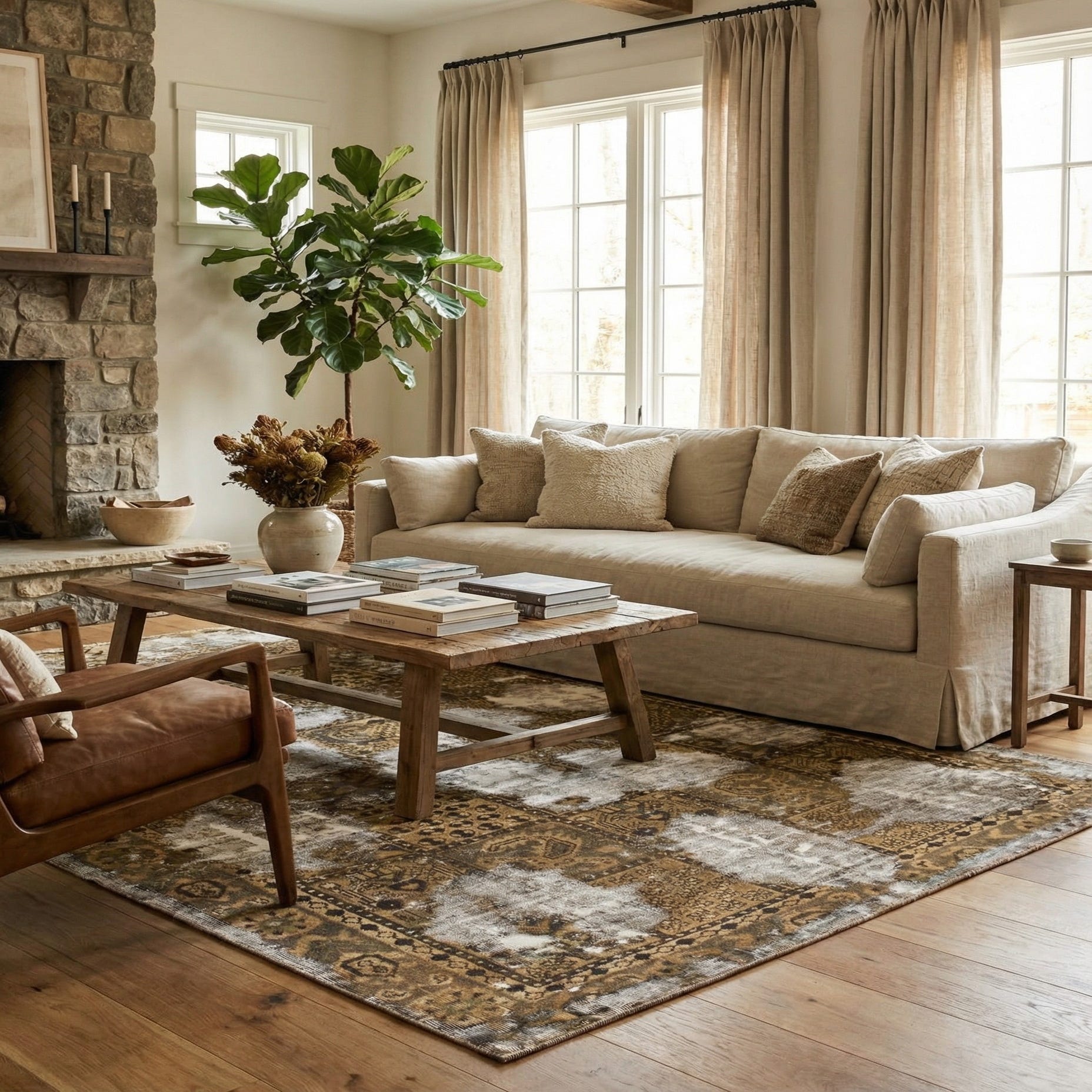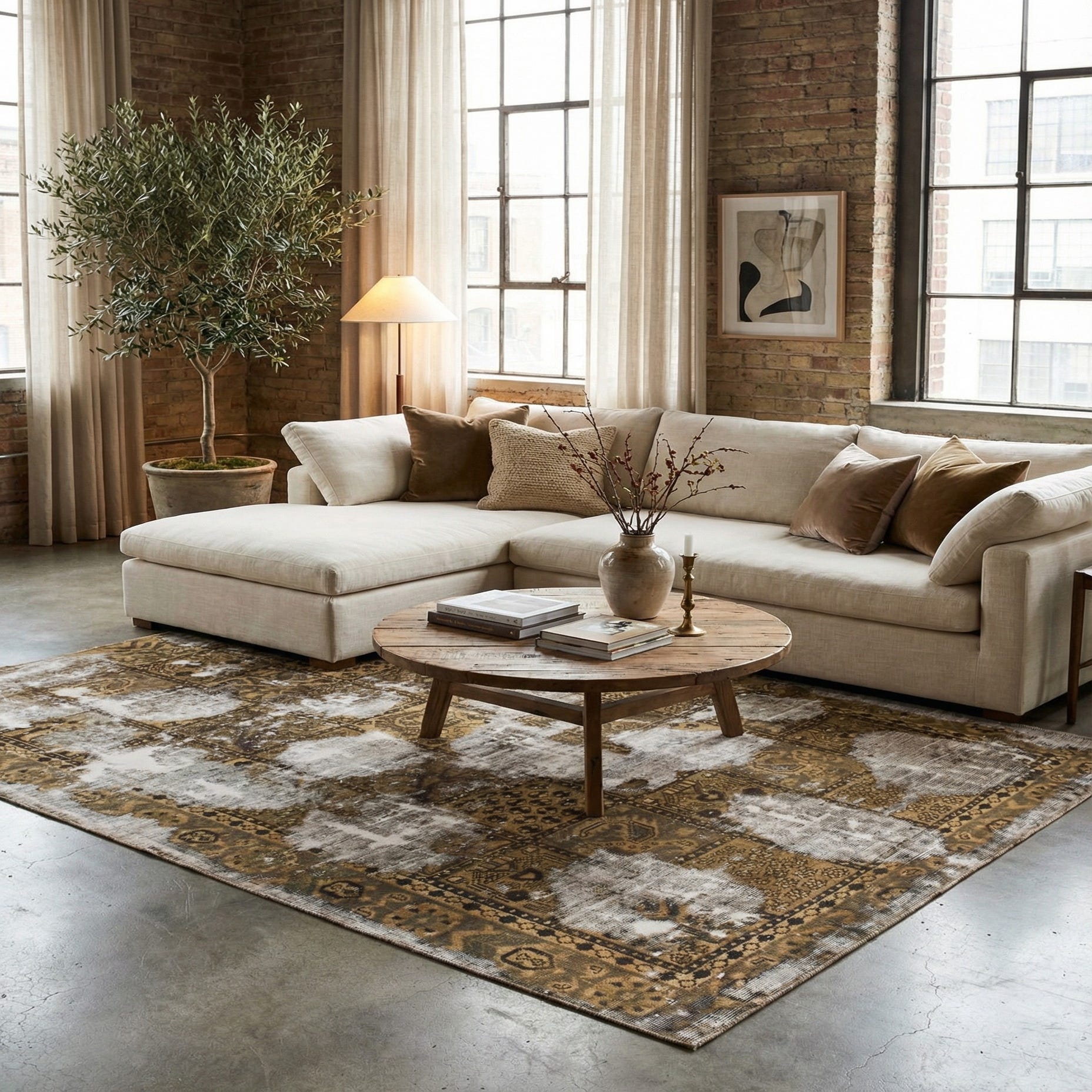 Primary color is Brown. Colors in this rug include: Brown, Ivory, Light Brown, Tan.