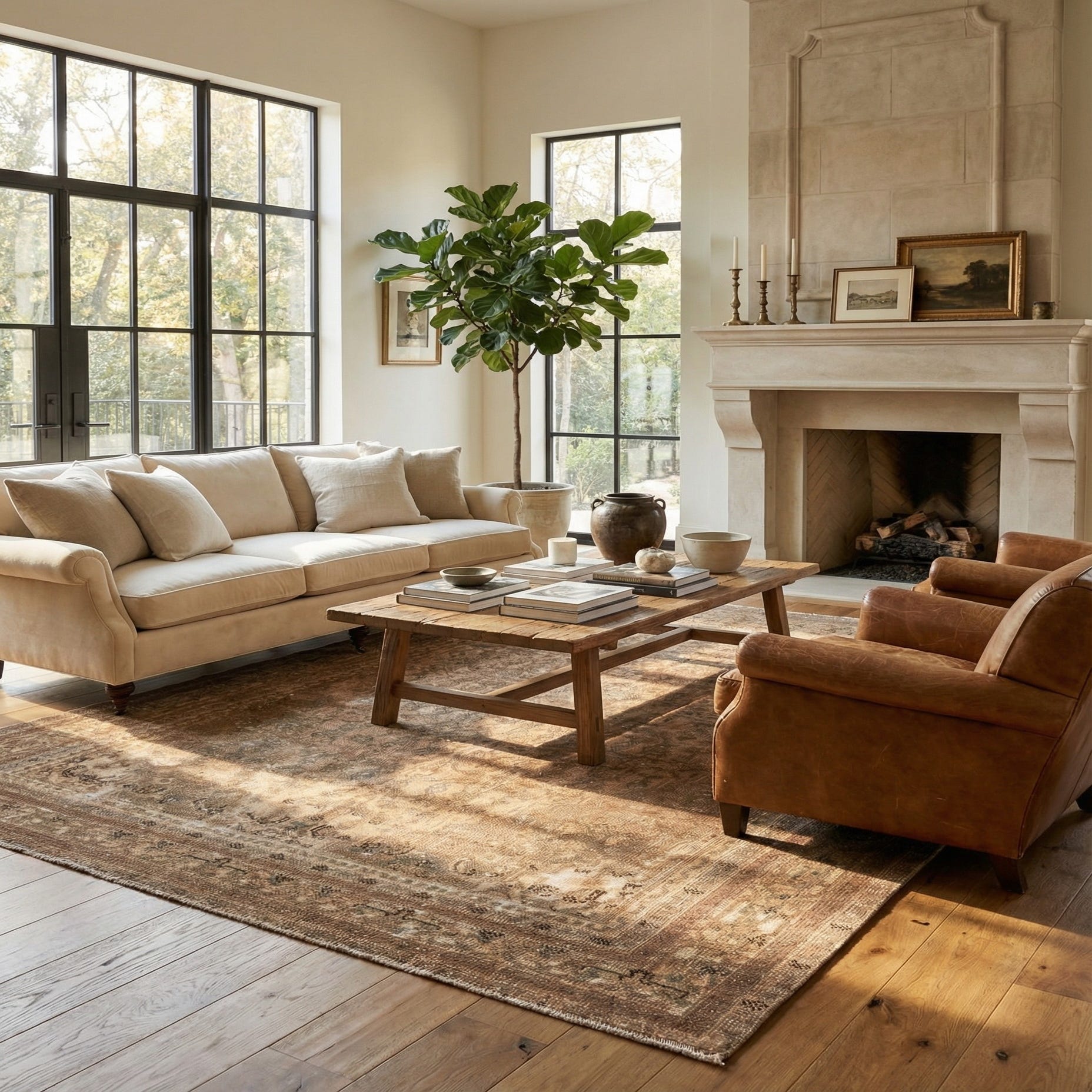 Primary color is Brown. Colors in this rug include: Brown, Beige, Ivory, Rust Red.