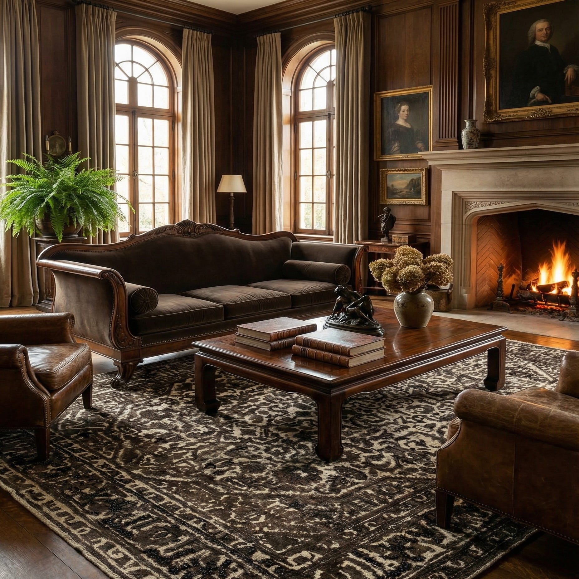 Primary color is Brown. Colors in this rug include: Brown, Beige.