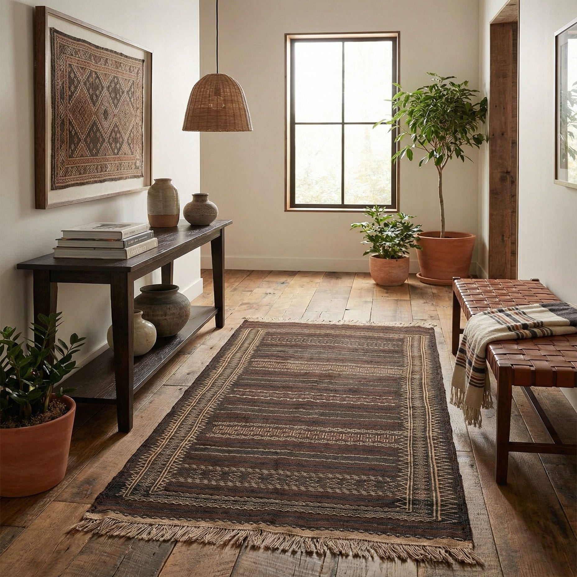 Primary color is Brown. Colors in this rug include: Brown, Navy Blue, Beige.