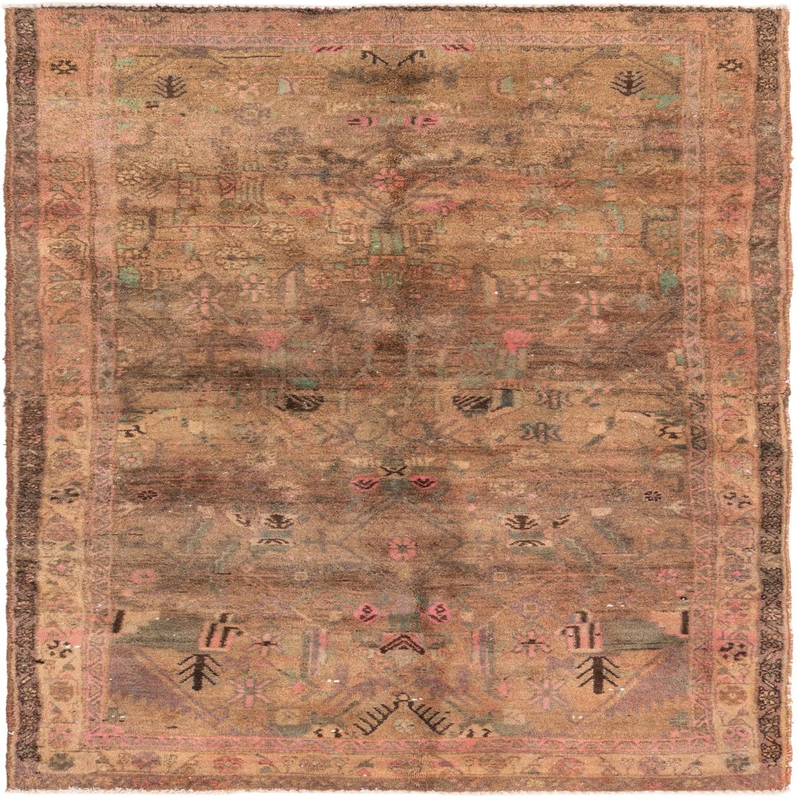 Primary color is Brown. Colors in this rug include: Brown, Green, Rust Red.