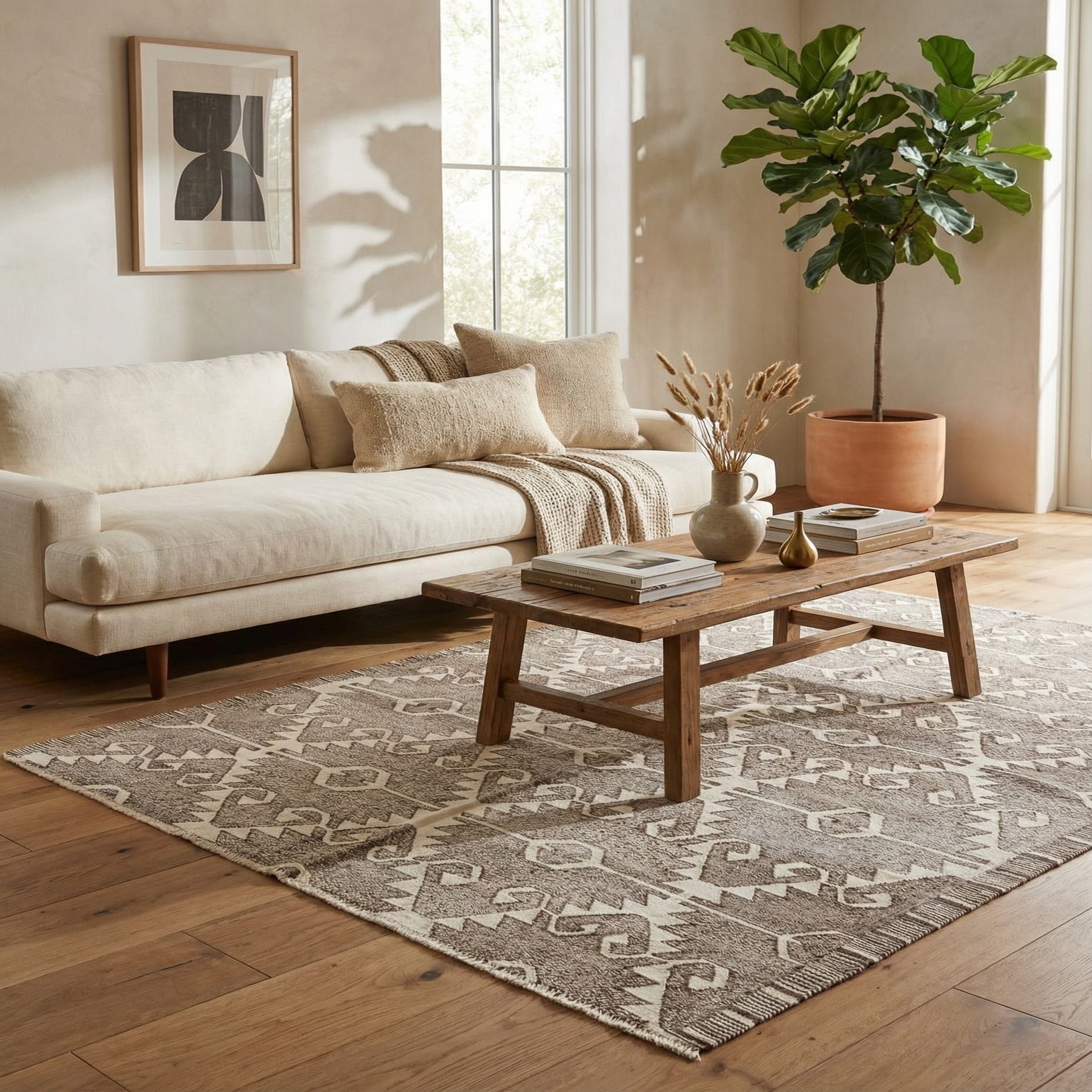 Primary color is Brown. Colors in this rug include: Brown, Ivory.
