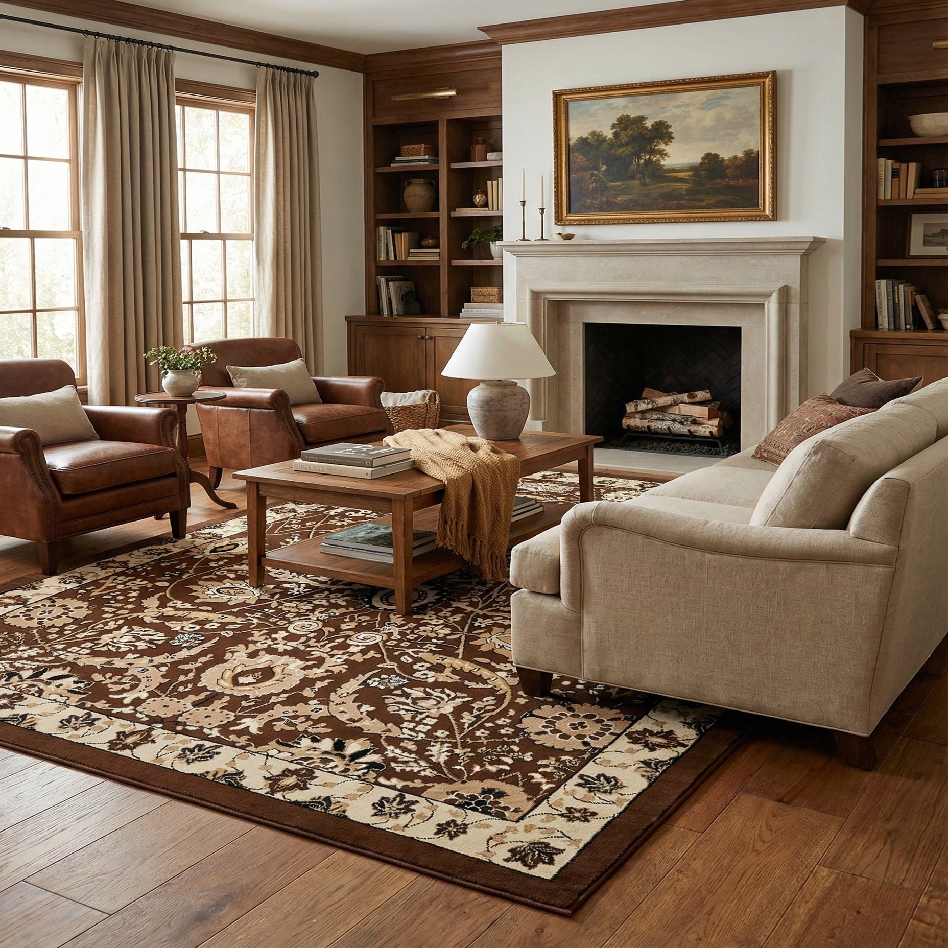 Primary color is Brown. Colors in this rug include: Brown, Beige, Black, Cream.