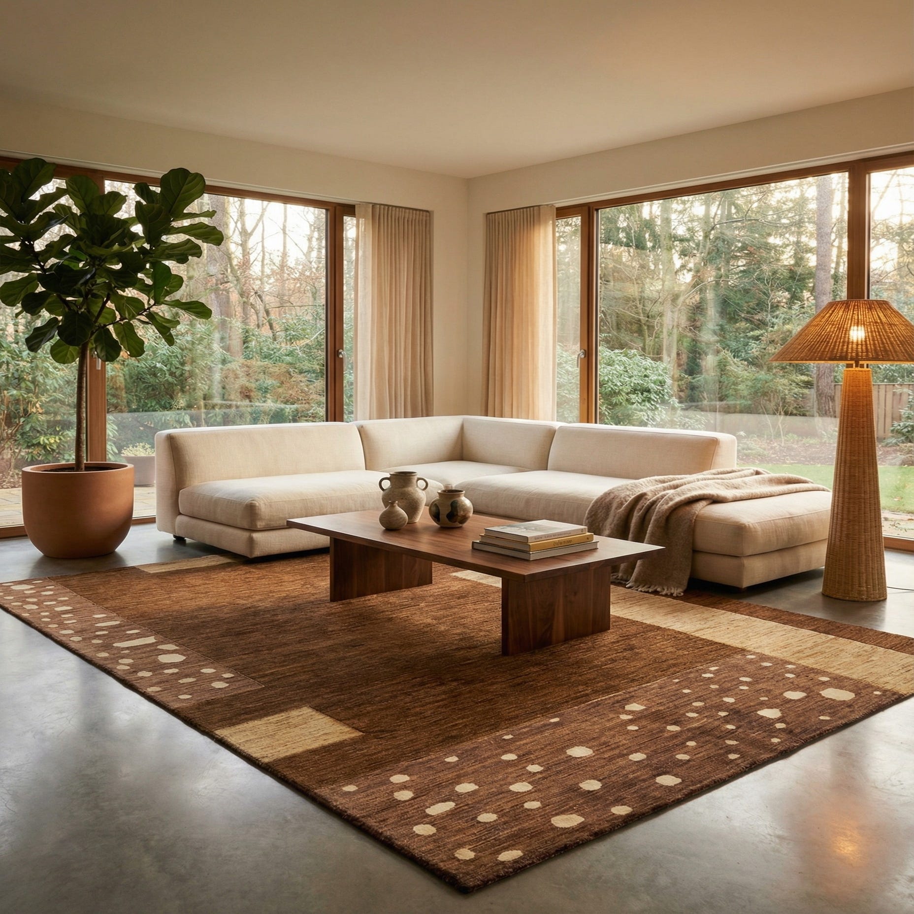 Primary color is Brown. Colors in this rug include: Brown, Cream.