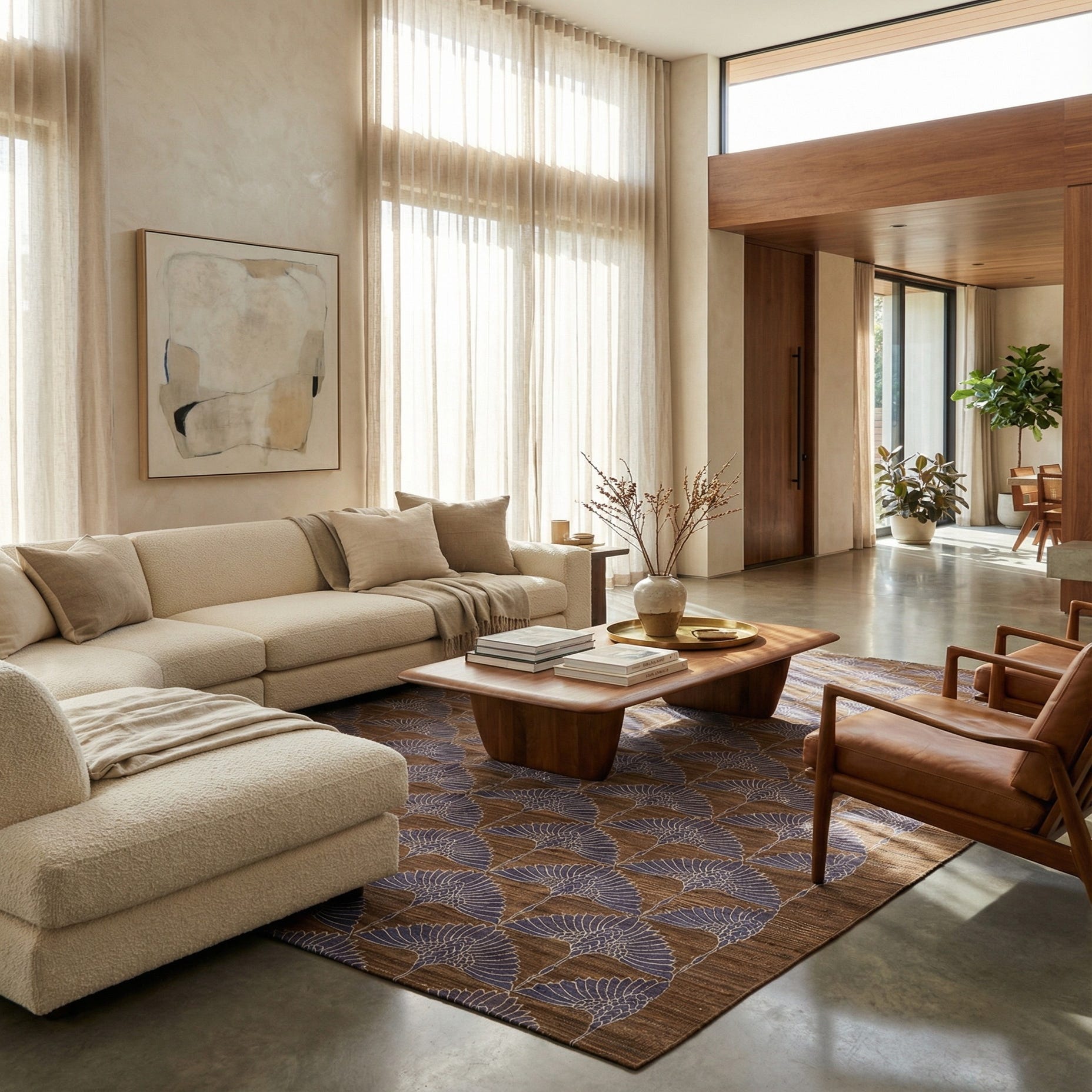 Primary color is Brown. Colors in this rug include: Brown, Navy Blue.