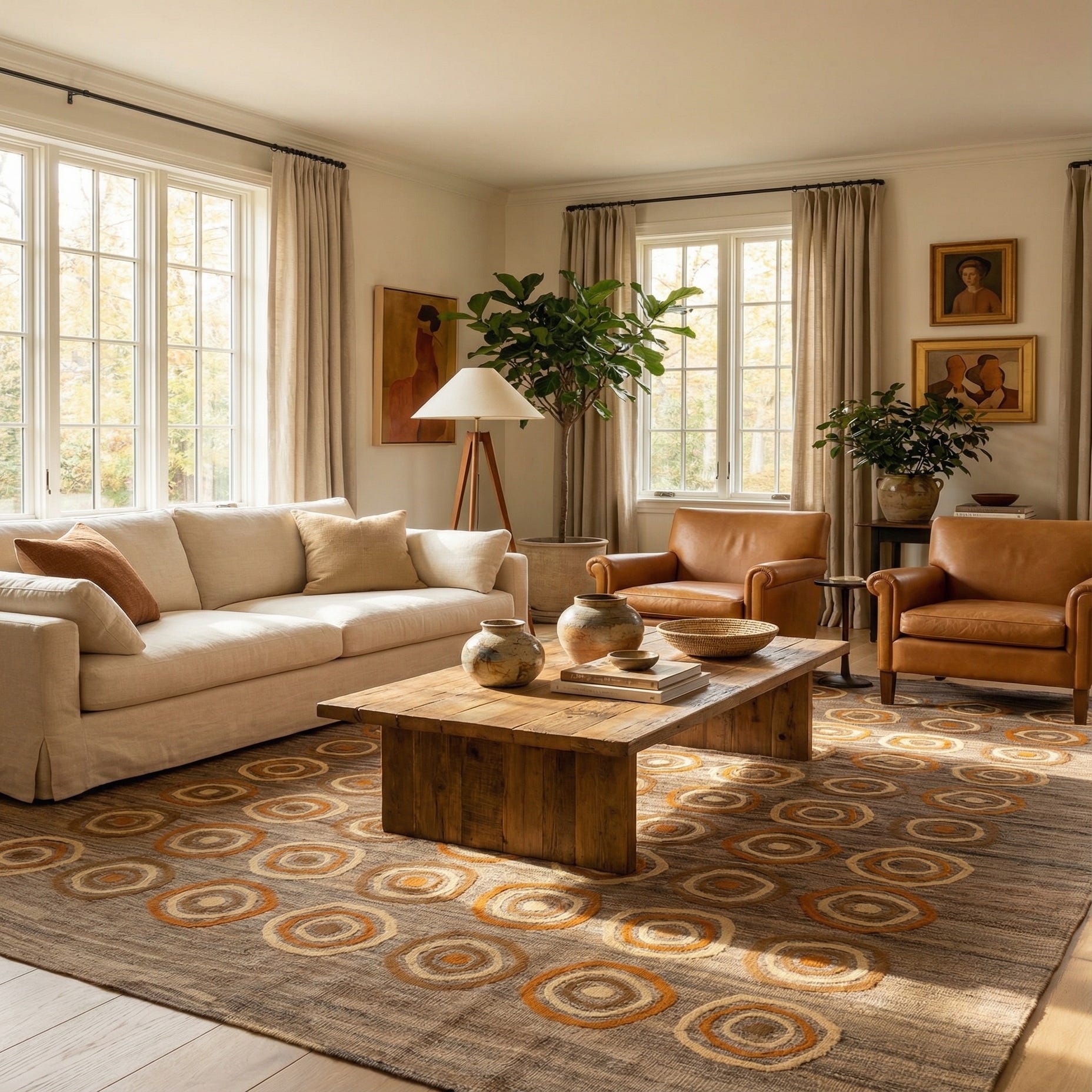 Primary color is Brown. Colors in this rug include: Brown, Beige, Terracotta, Tan.