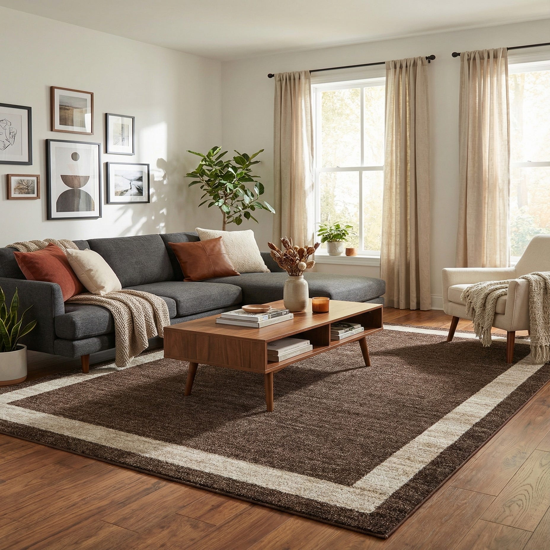 Primary color is Brown. Colors in this rug include: Brown, Ivory.
