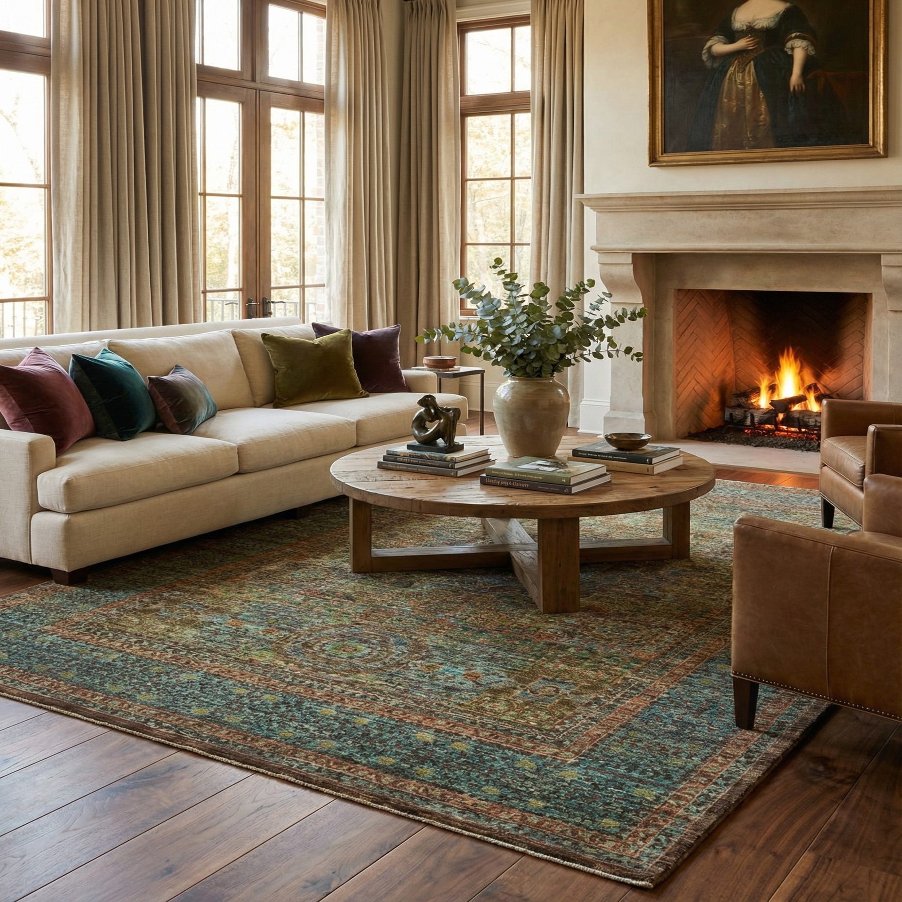 Primary color is Brown. Colors in this rug include: Brown, Blue, Cream, Green, Terracotta.