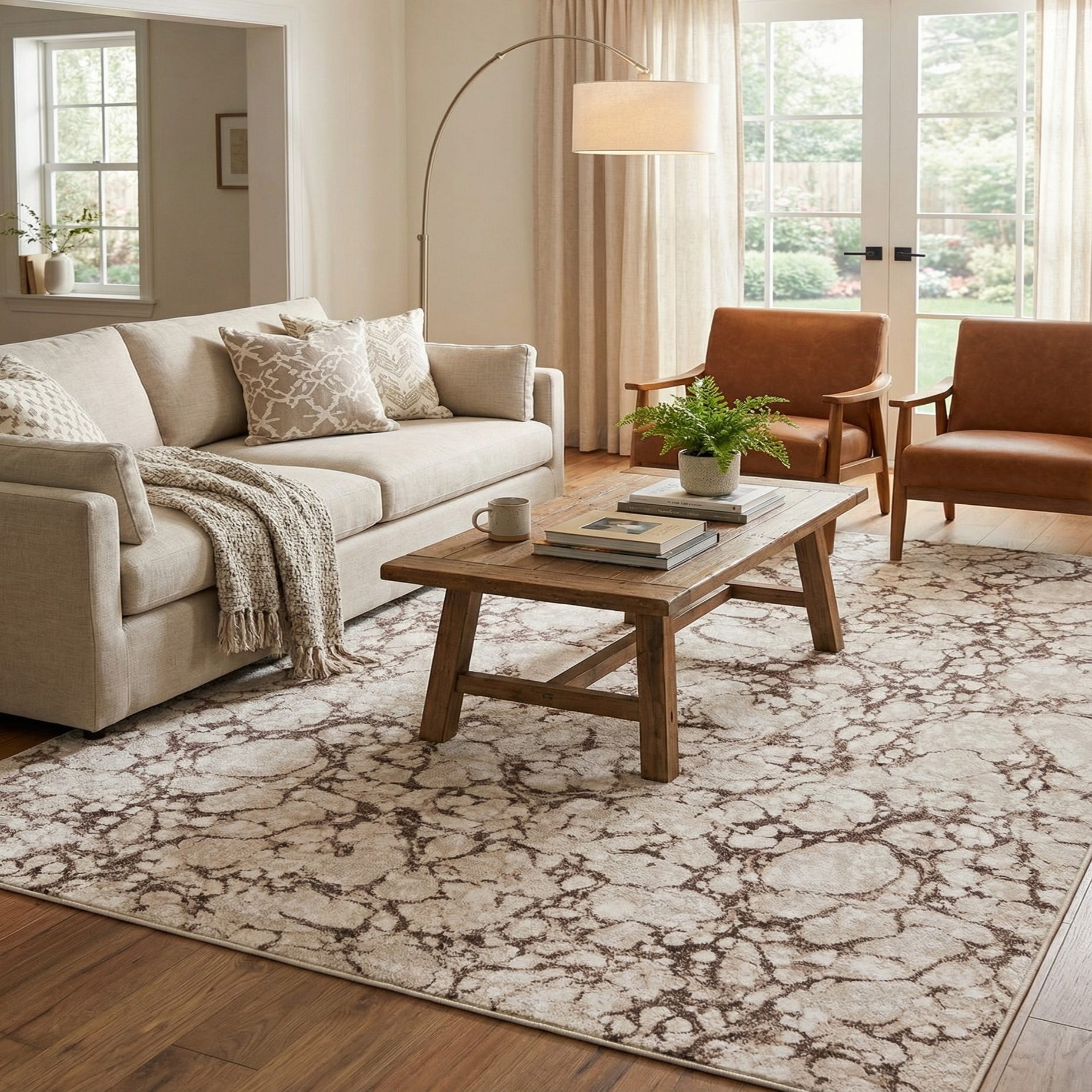 Primary color is Brown. Colors in this rug include: Brown, Beige, Ivory.