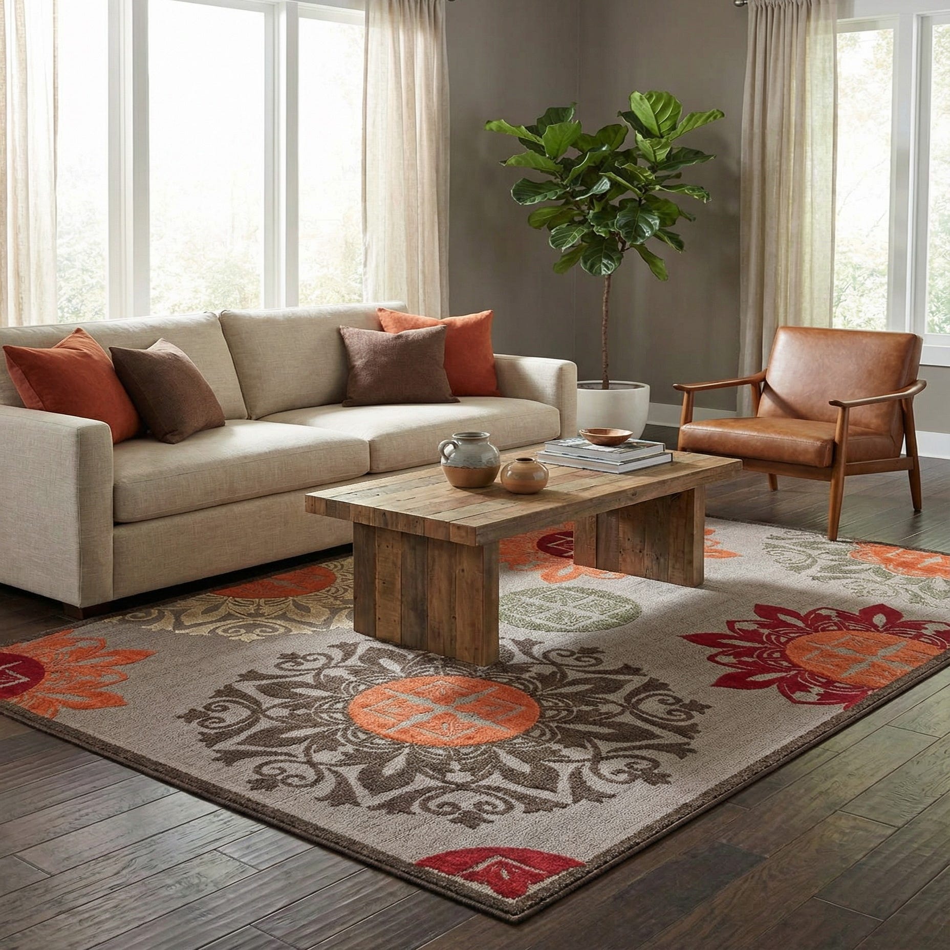 Primary color is Brown. Colors in this rug include: Brown, Beige, Gray, Orange, Red.