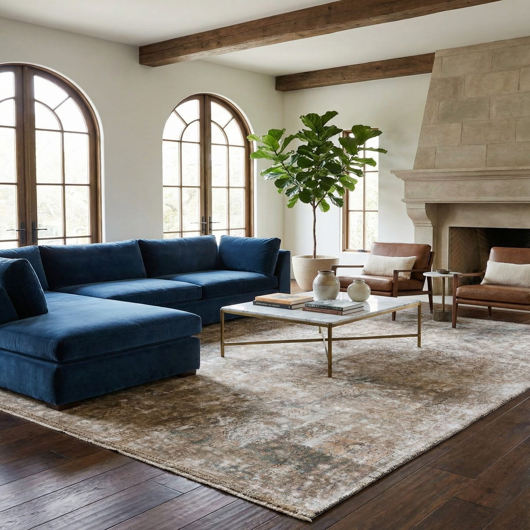 Primary color is Brown. Colors in this rug include: Brown, Beige, Ivory, Navy Blue.