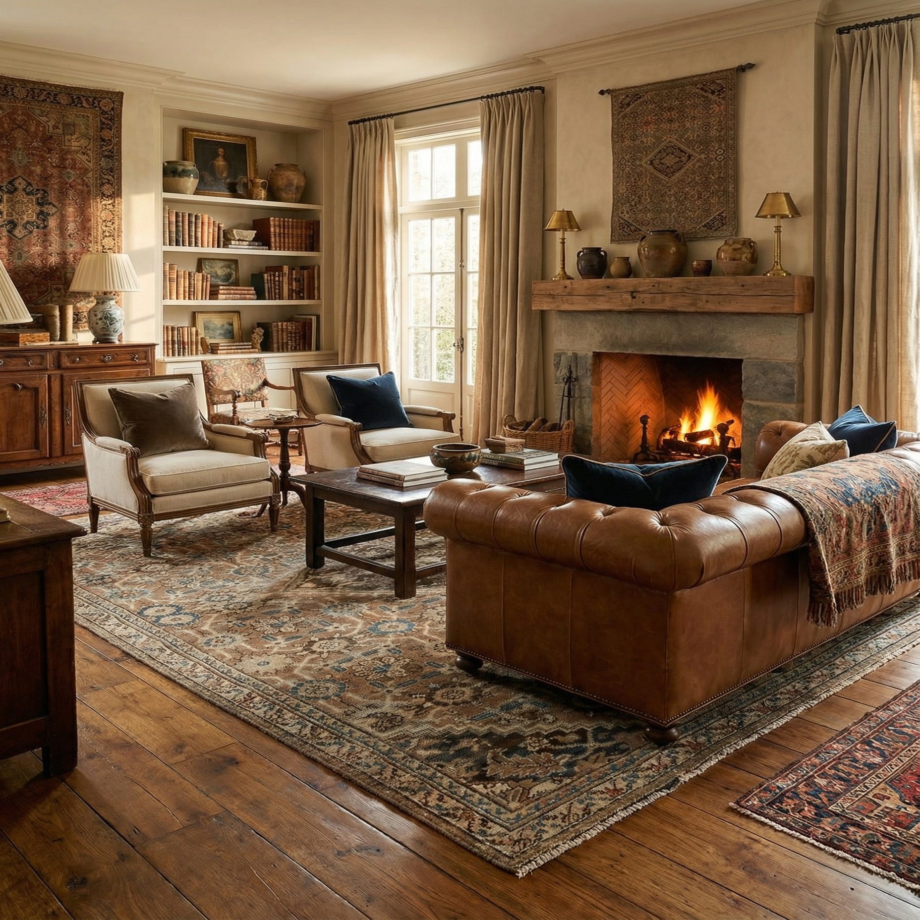 Primary color is Brown. Colors in this rug include: Brown, Brown, Cream, Blue, Purple, Beige.
