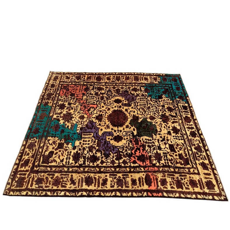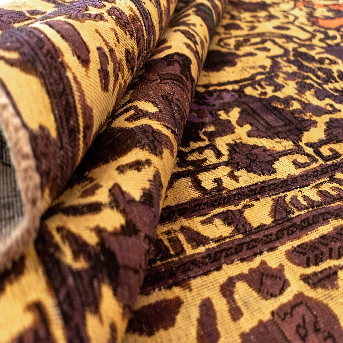 Primary color is Brown. Colors in this rug include: Brown, Violet, Orange, Blue.