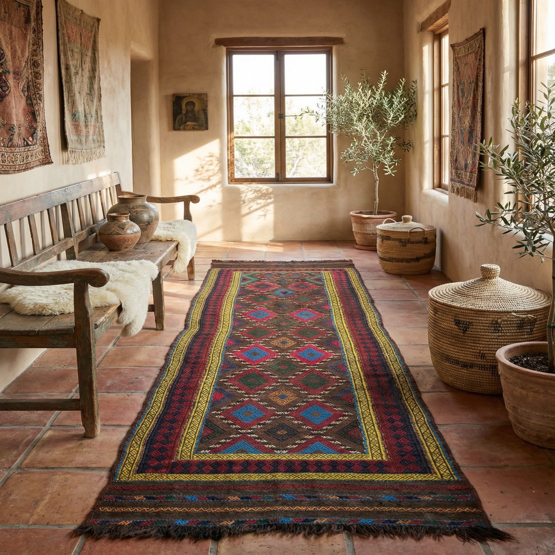 Primary color is Brown. Colors in this rug include: Brown, Black, Red, Yellow, Green.