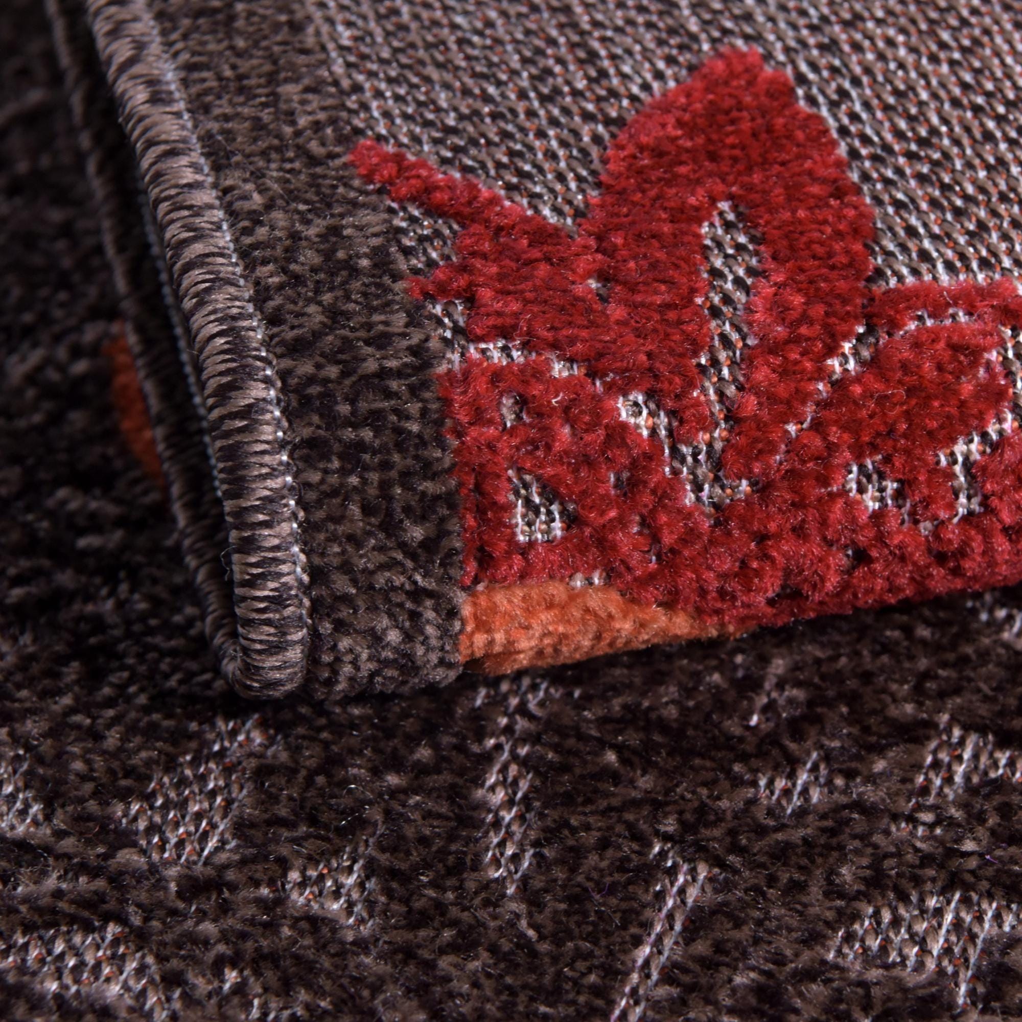 Primary color is Brown. Colors in this rug include: Brown, Beige, Gray, Orange, Red.