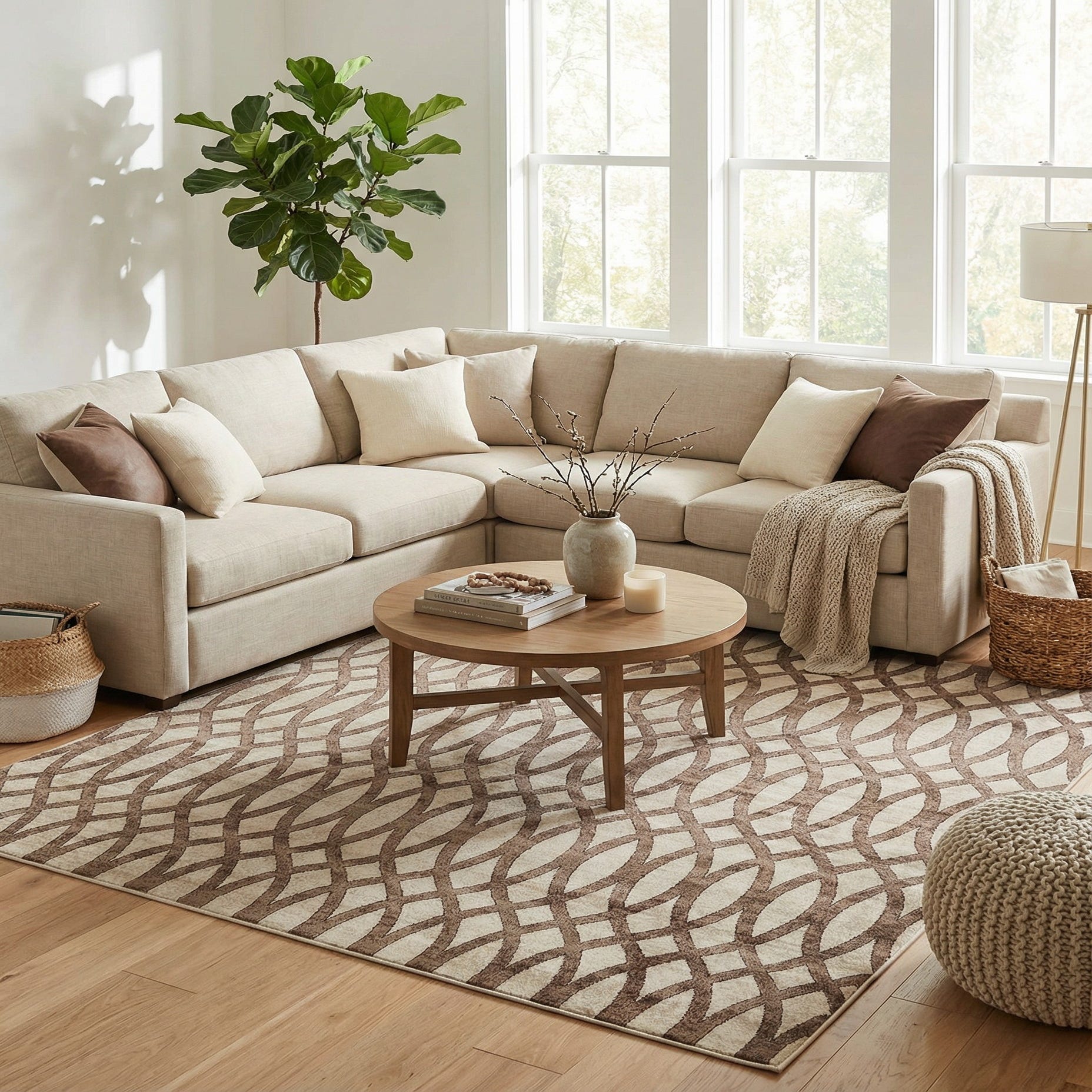 Primary color is Brown. Colors in this rug include: Brown, Beige, Light Brown.