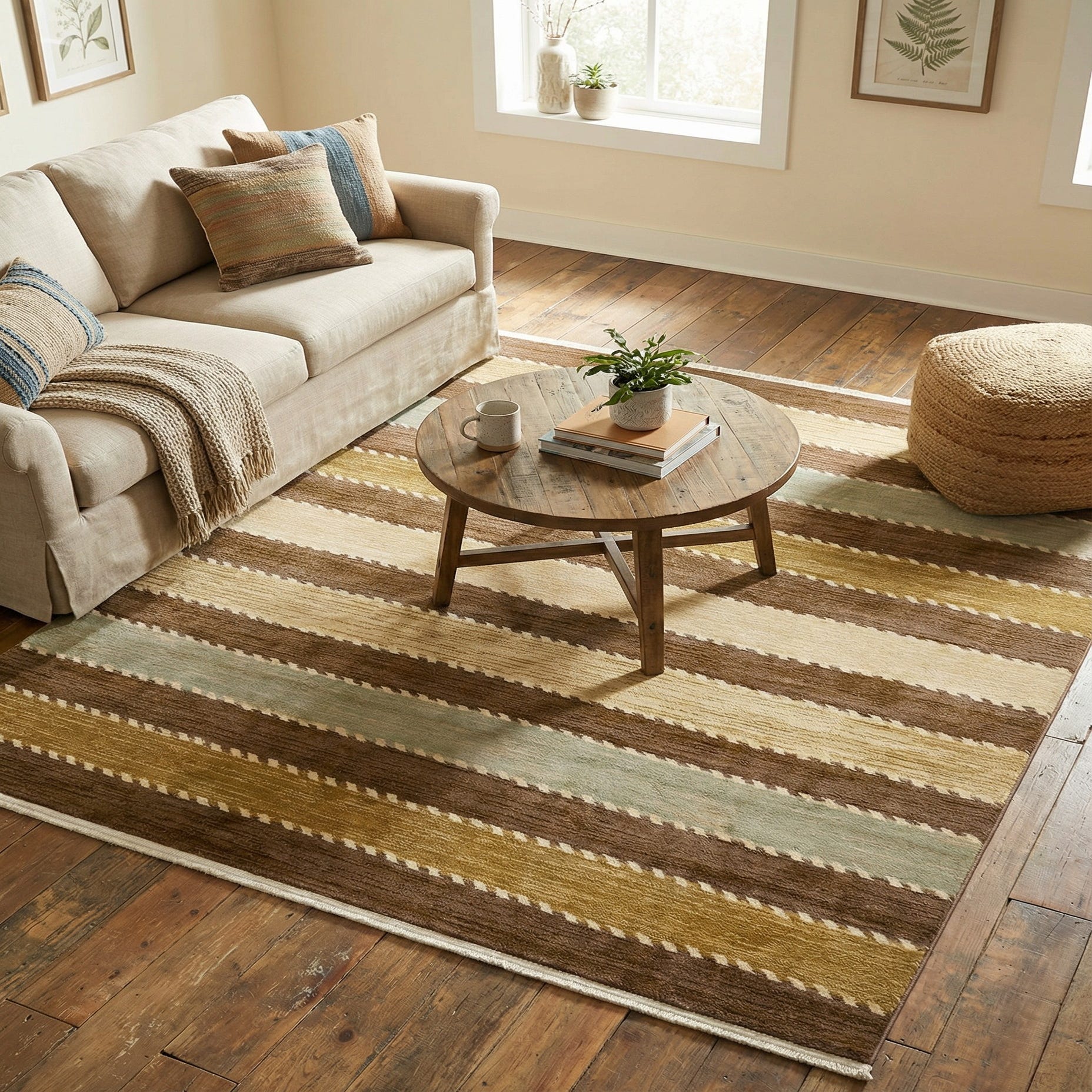 Primary color is Brown. Colors in this rug include: Brown, Beige, Cream, Light Green.