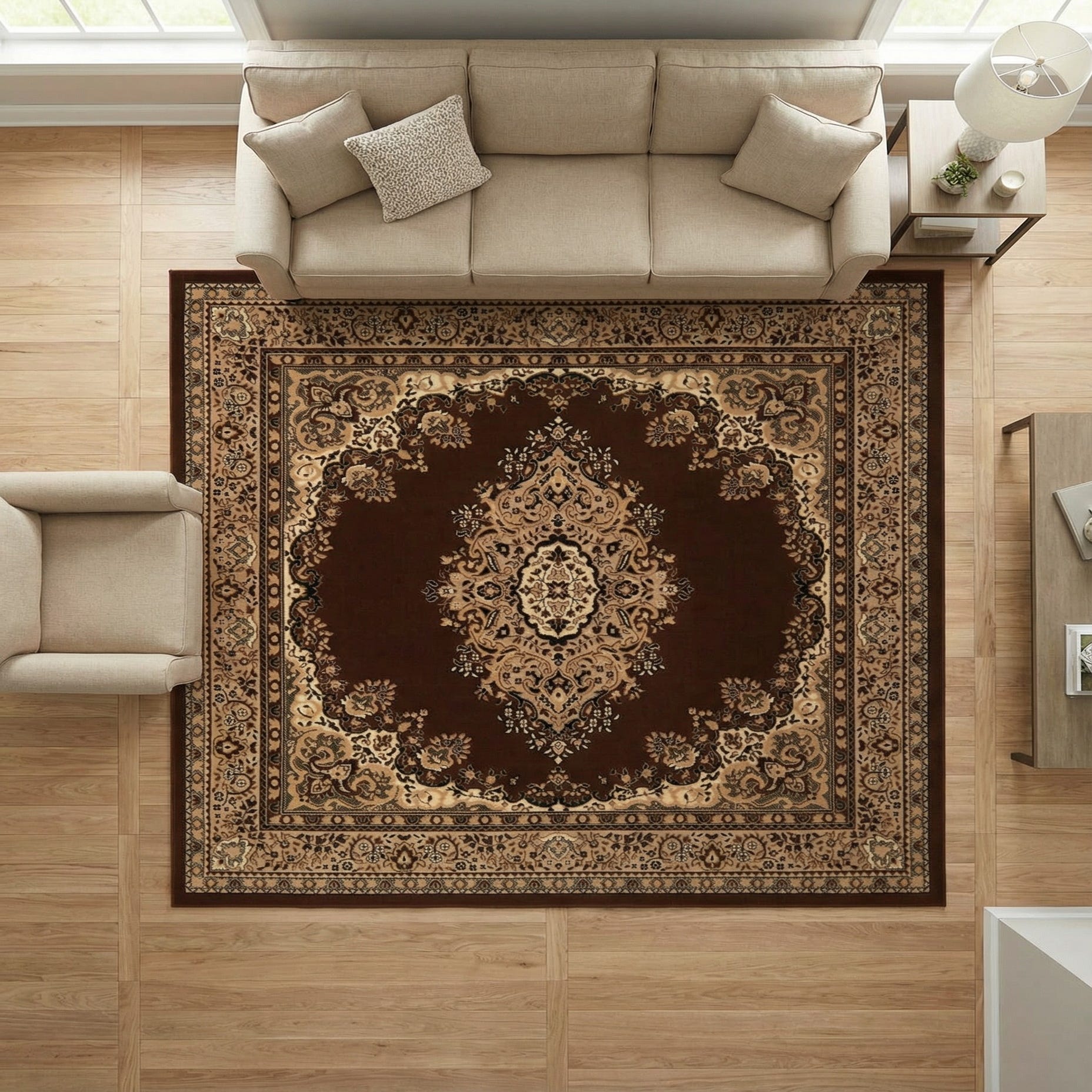 Primary color is Brown. Colors in this rug include: Brown, Black, Cream, Tan.