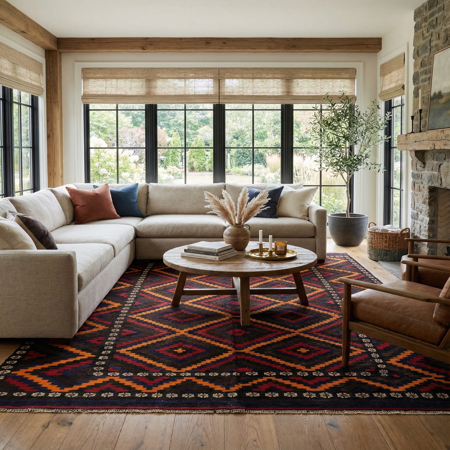 Primary color is Brown. Colors in this rug include: Brown, Burgundy, Orange, Navy Blue, Beige, Black.