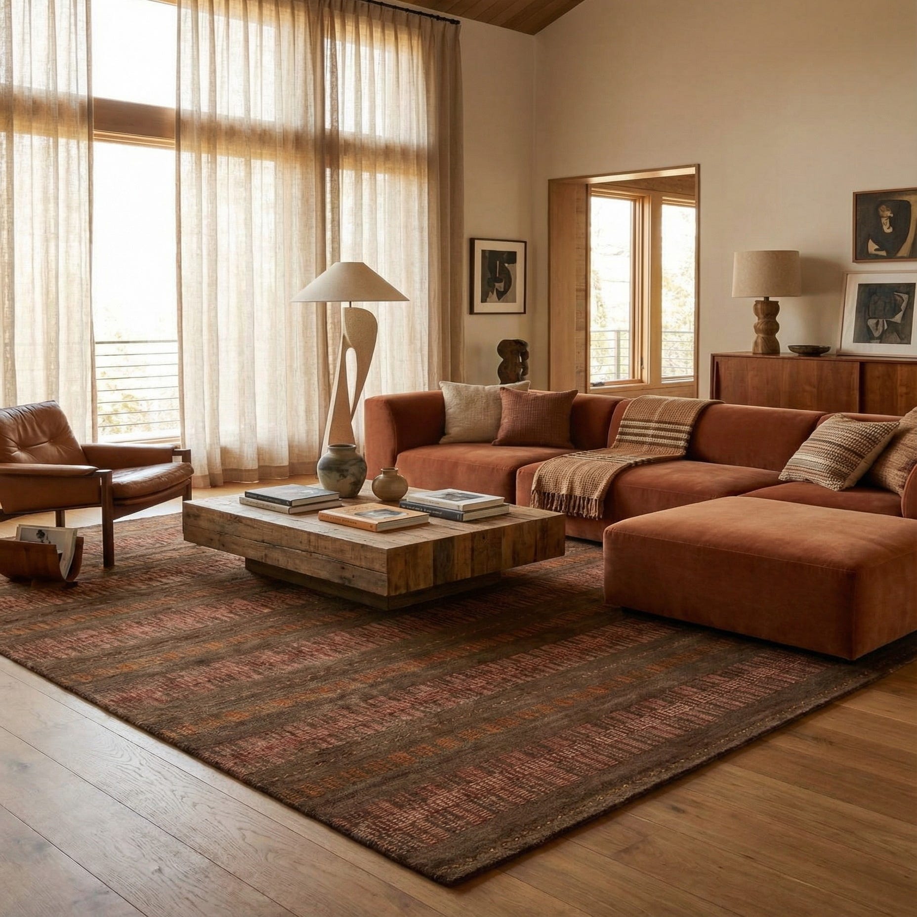 Primary color is Brown. Colors in this rug include: Brown, Red, Green, Orange.
