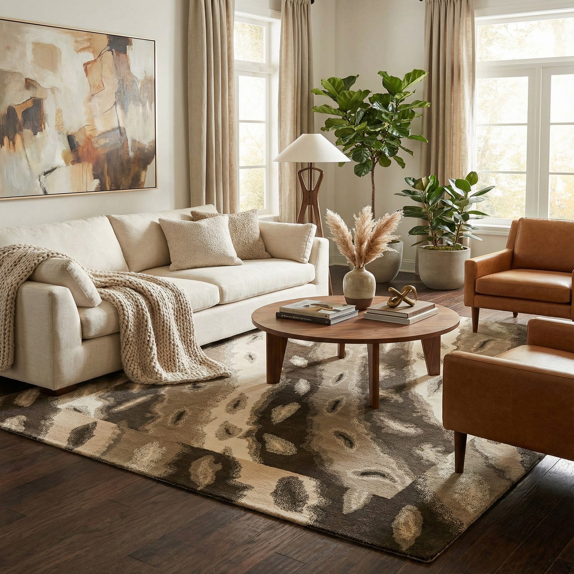Primary color is Brown. Colors in this rug include: Brown, Ivory, Gray.