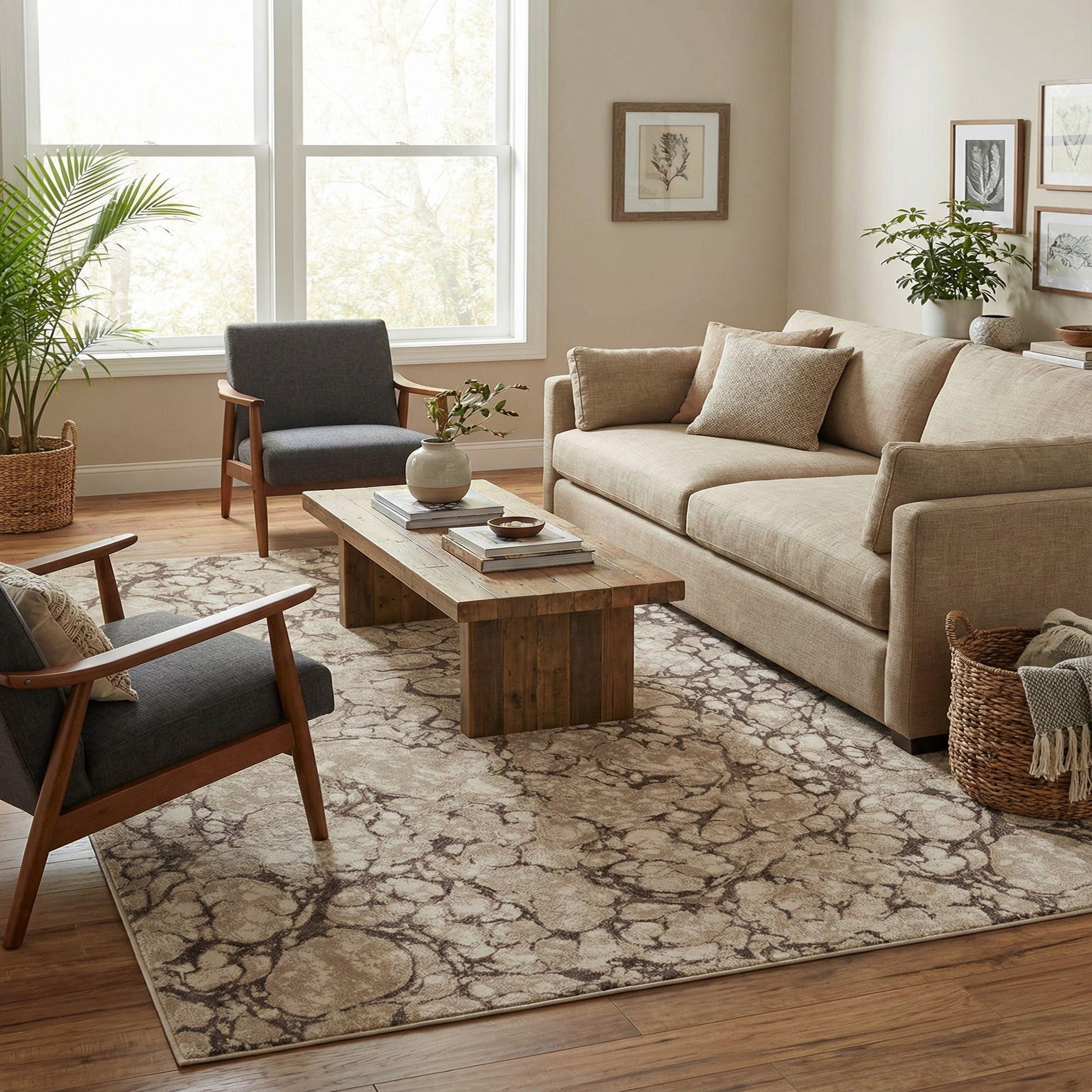 Primary color is Brown. Colors in this rug include: Brown, Beige, Ivory.