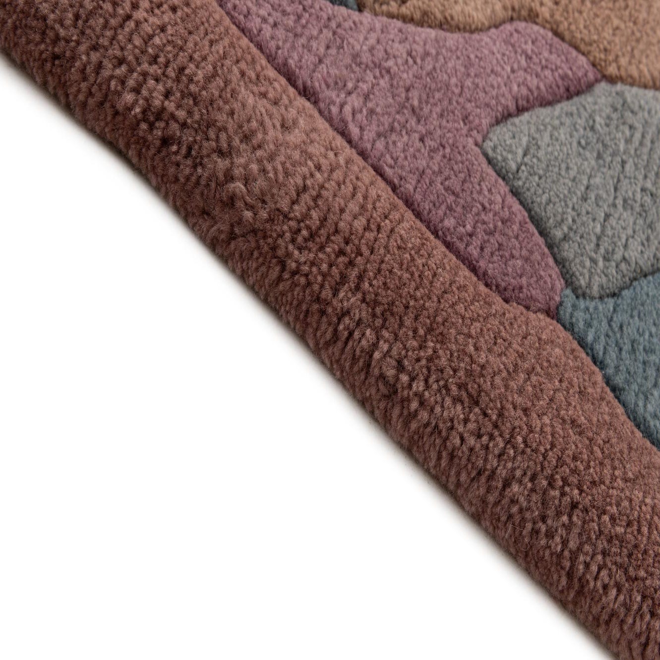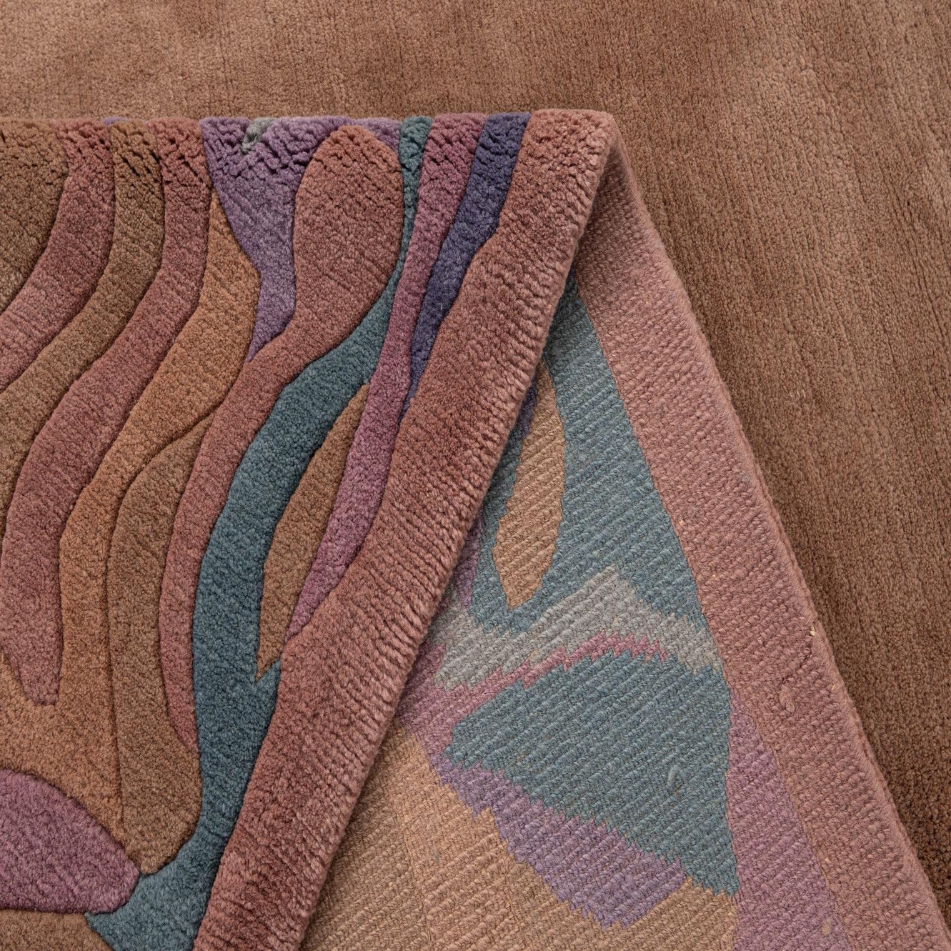 Primary color is Brown. Colors in this rug include: Brown, Blue, Light Blue, Purple, Pink.