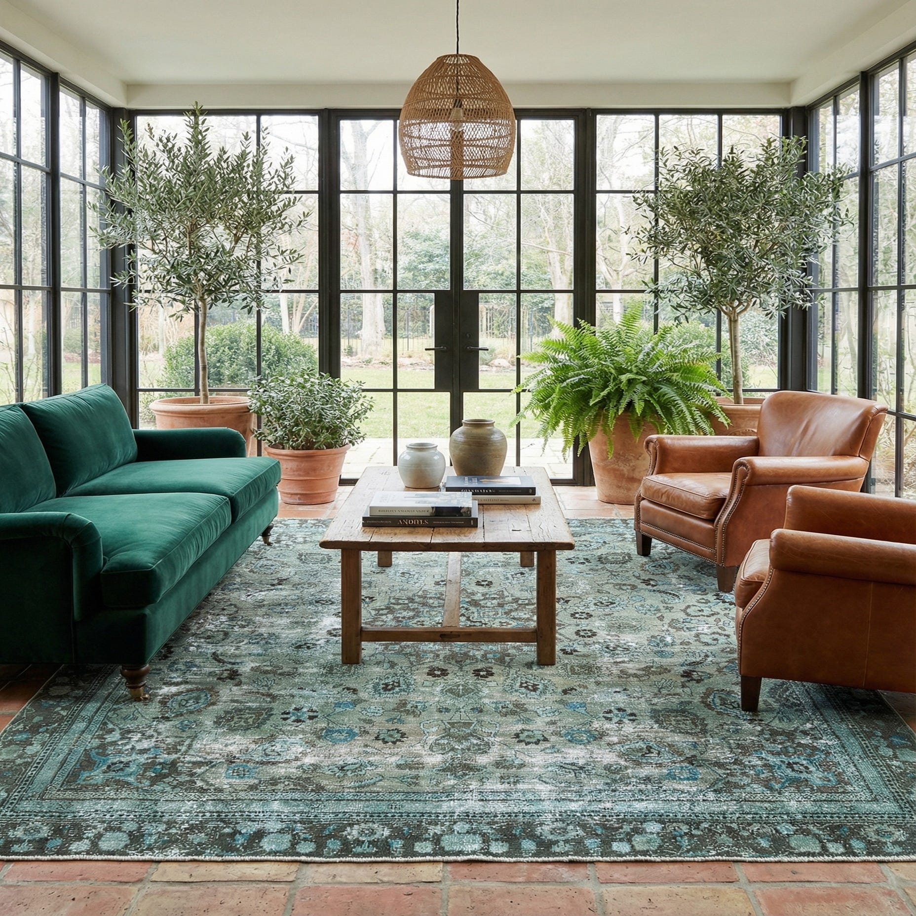 Primary color is Brown. Colors in this rug include: Brown, Blue, Dark Blue, Green.
