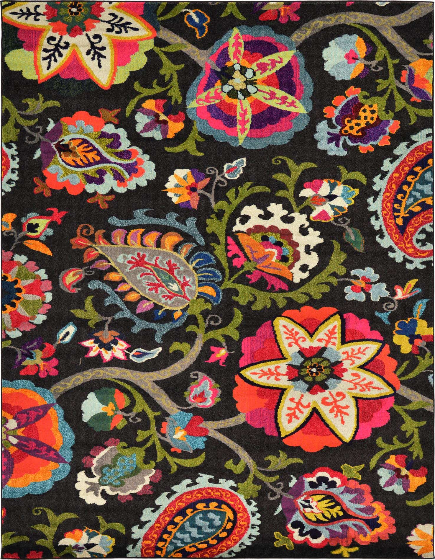 Primary color is Brown. Colors in this rug include: Brown, Gold, Gray, Green, Light Blue, Light Green, Navy Blue, Orange, Red, Violet, Pink.