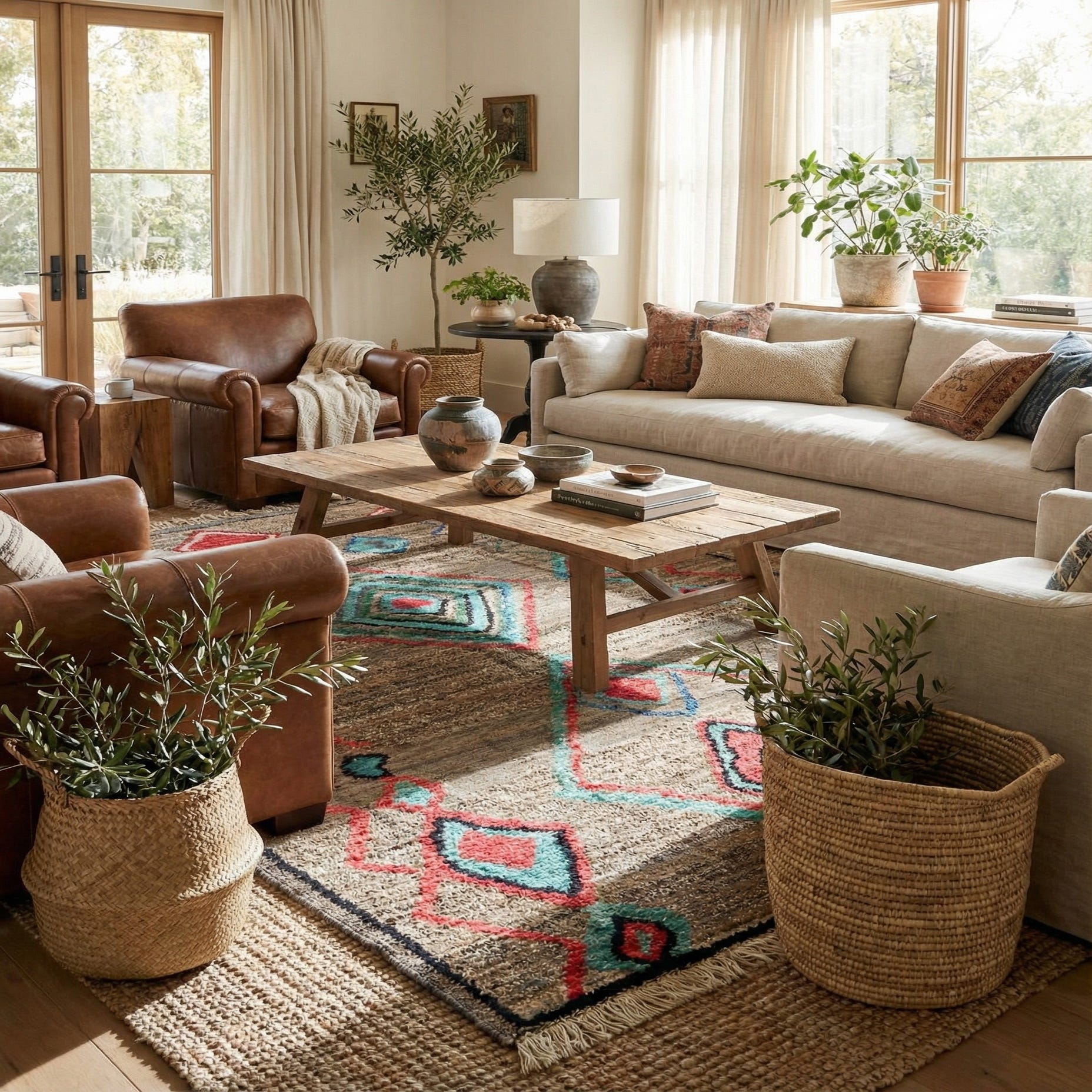 Primary color is Brown. Colors in this rug include: Brown, Blue, Gray, Green, Red, Pink, Turquoise.