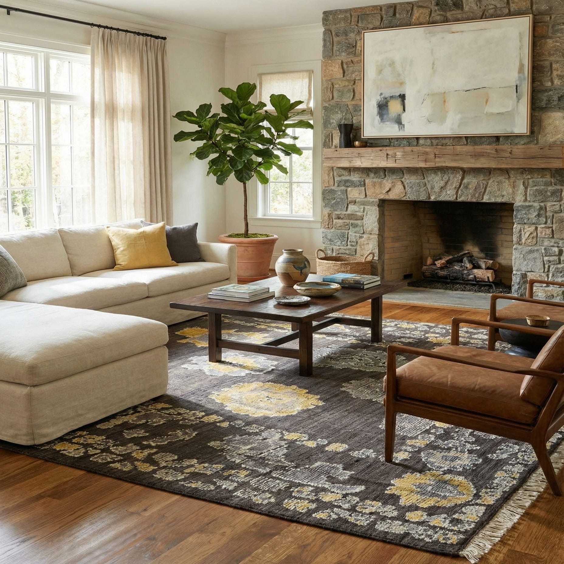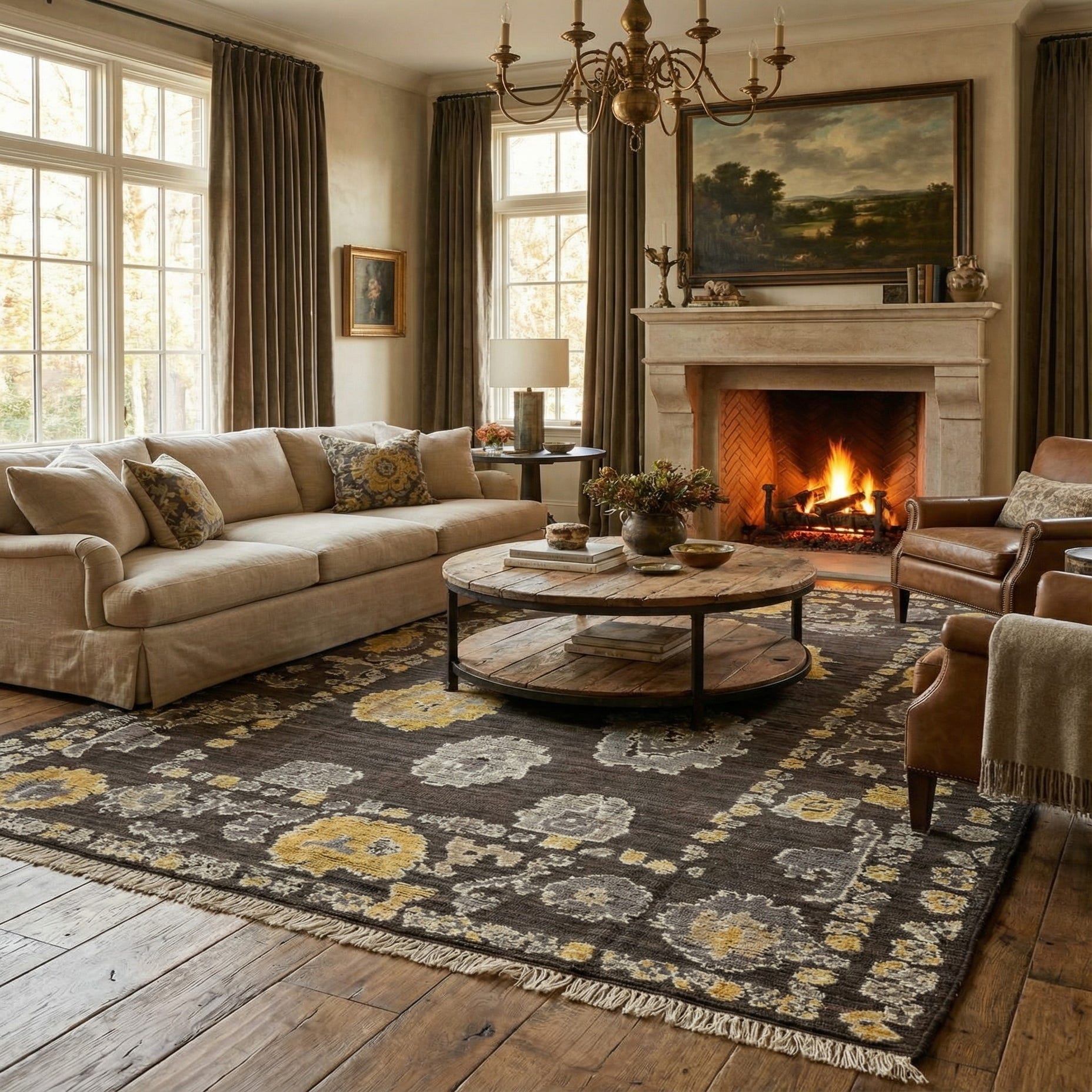 Primary color is Brown. Colors in this rug include: Brown, Gray, Ivory, Yellow.